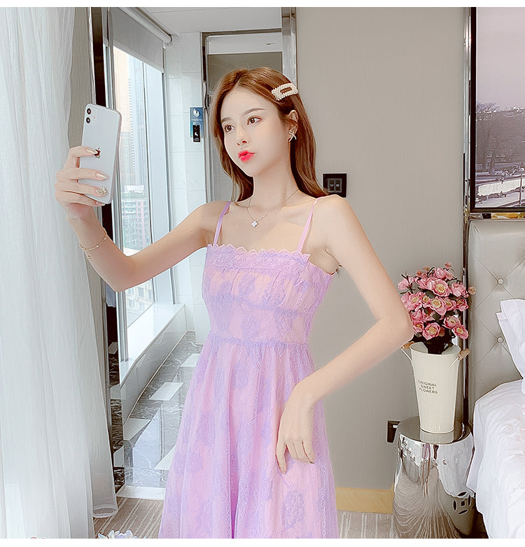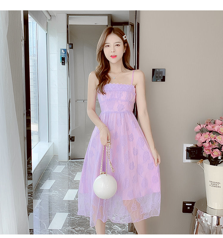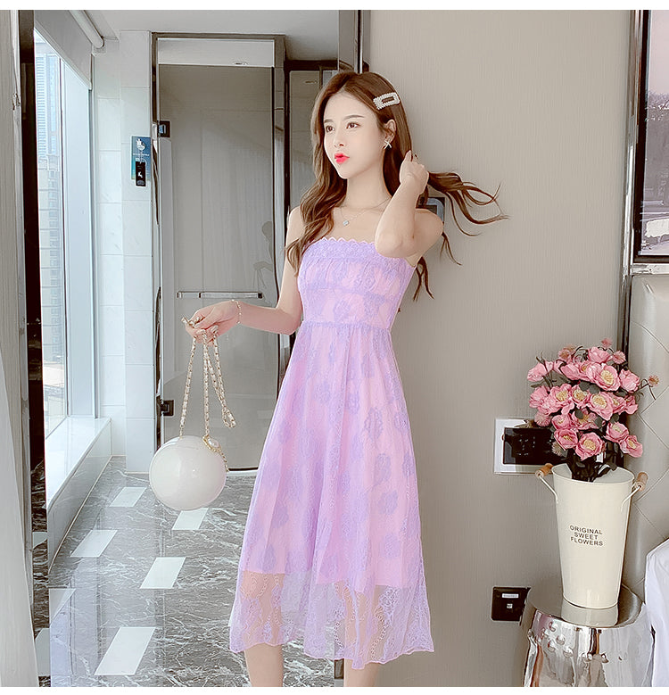 Retro Square Neck Sling Strap Skirt Sweet Lace Lovely Fairy Bell Flower Princess Dress