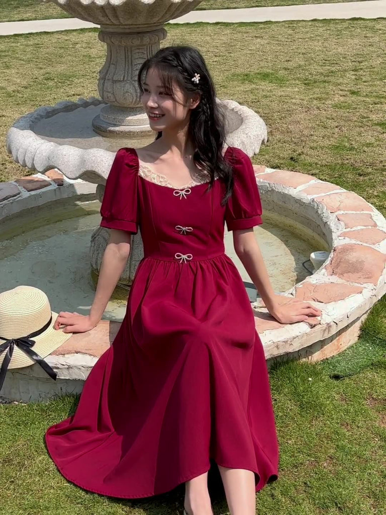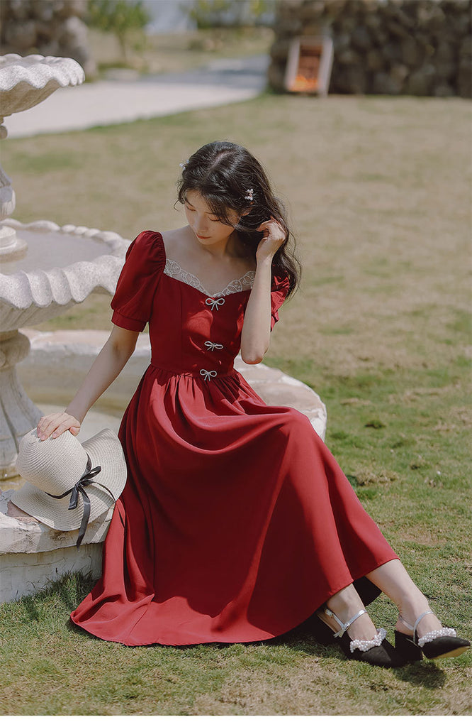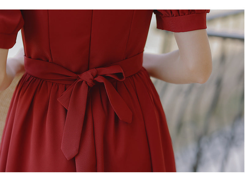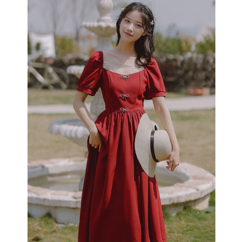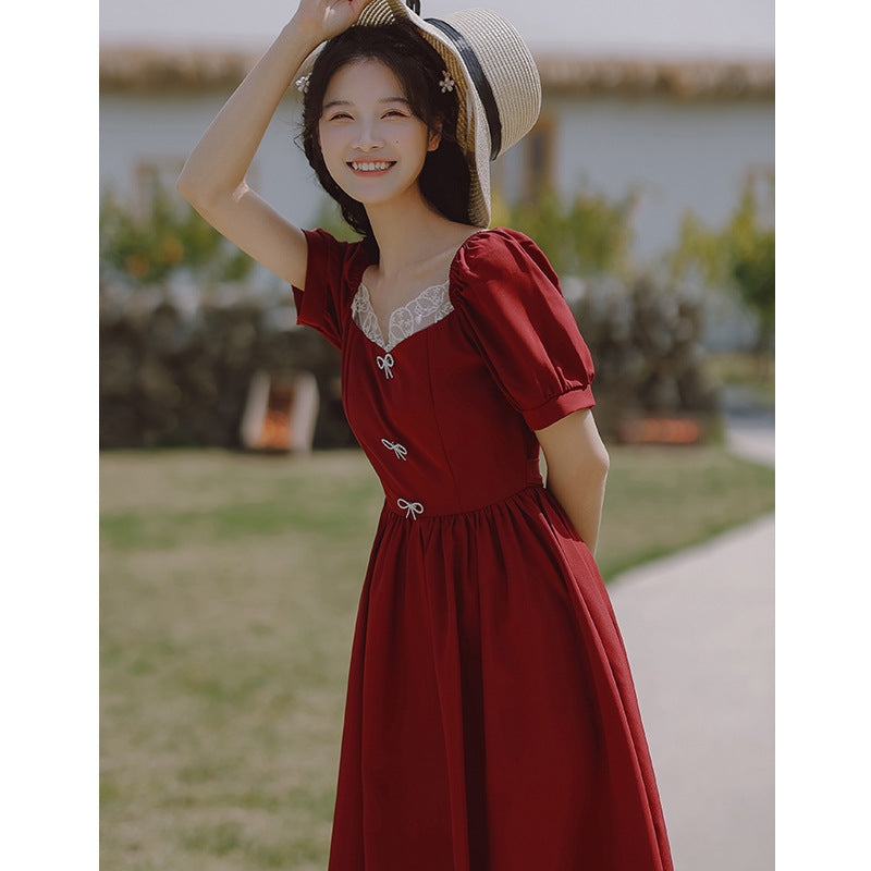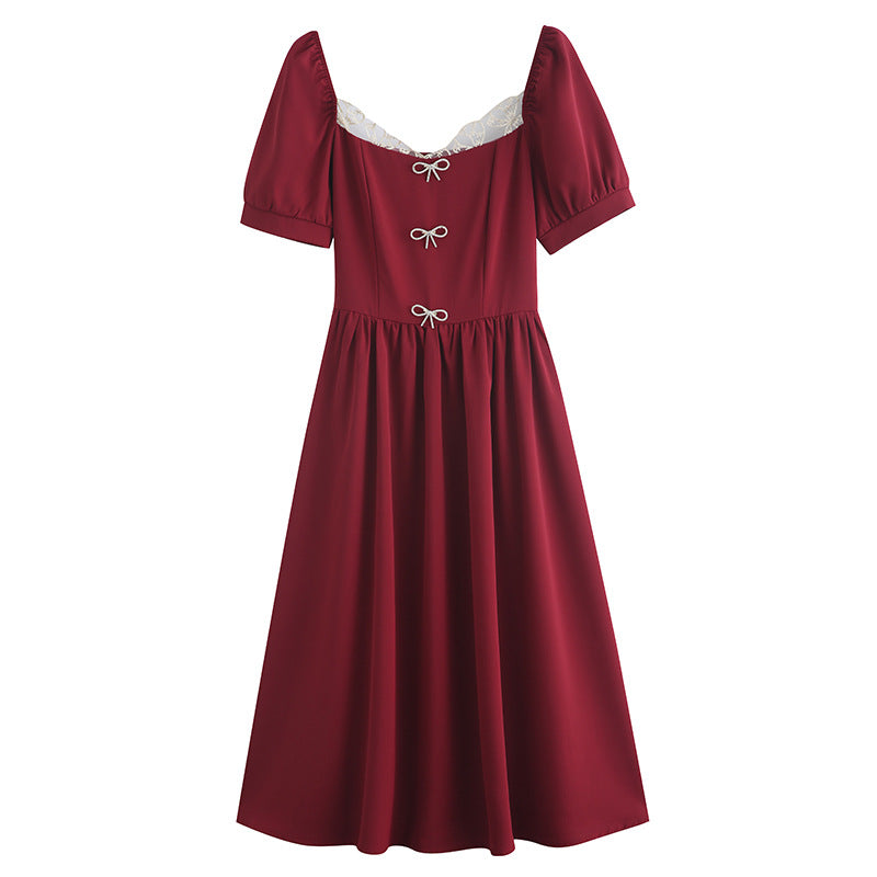 Retro Women Square Neck Bow Waist Puff Short Sleeves Lace Neckline Mid Length Ruffle A Line Dress