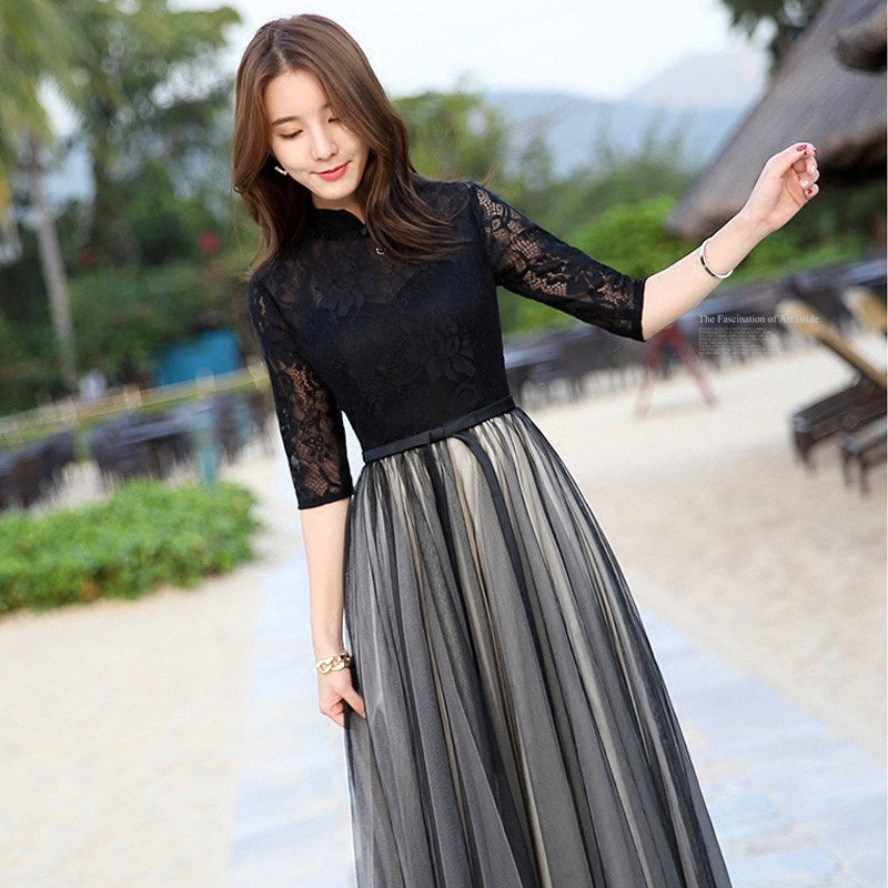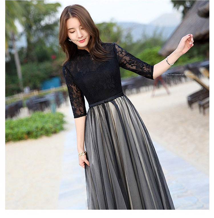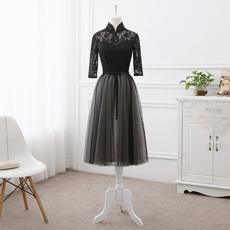 Sparkly Summer Elegant Women Retro Stand Collar Lace Half Length Sleeve Black Long Banquet Evening Dress