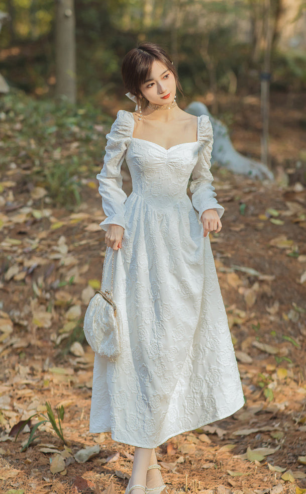 Spring Retro Palace Style Jacquard Temperament Square Collar Long Sleeved Dress