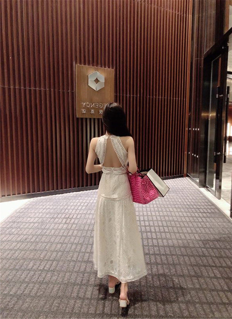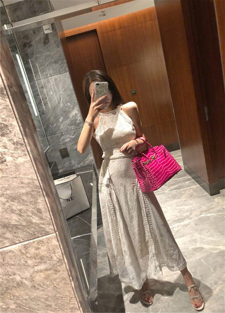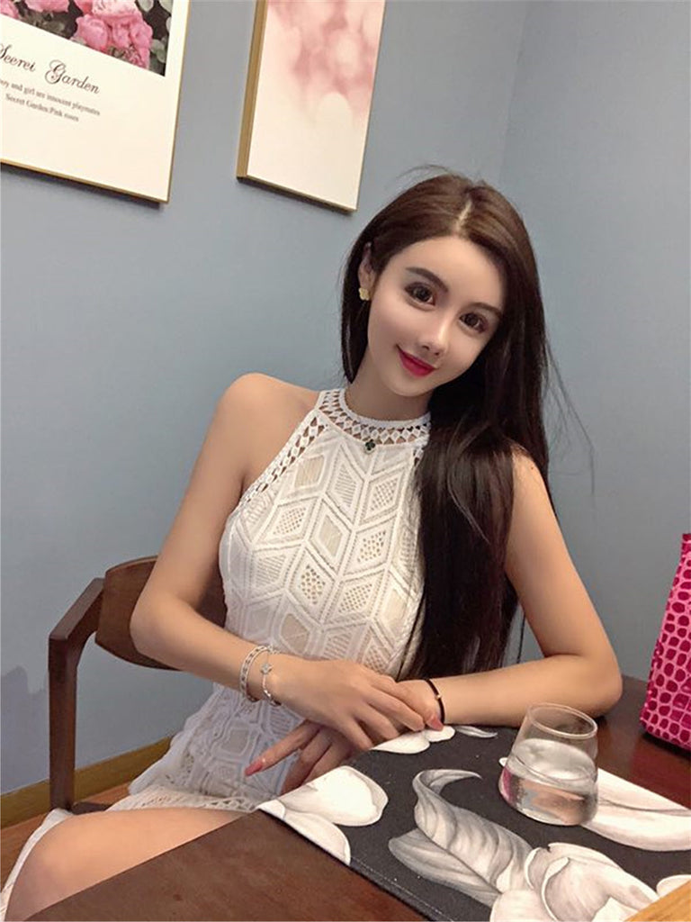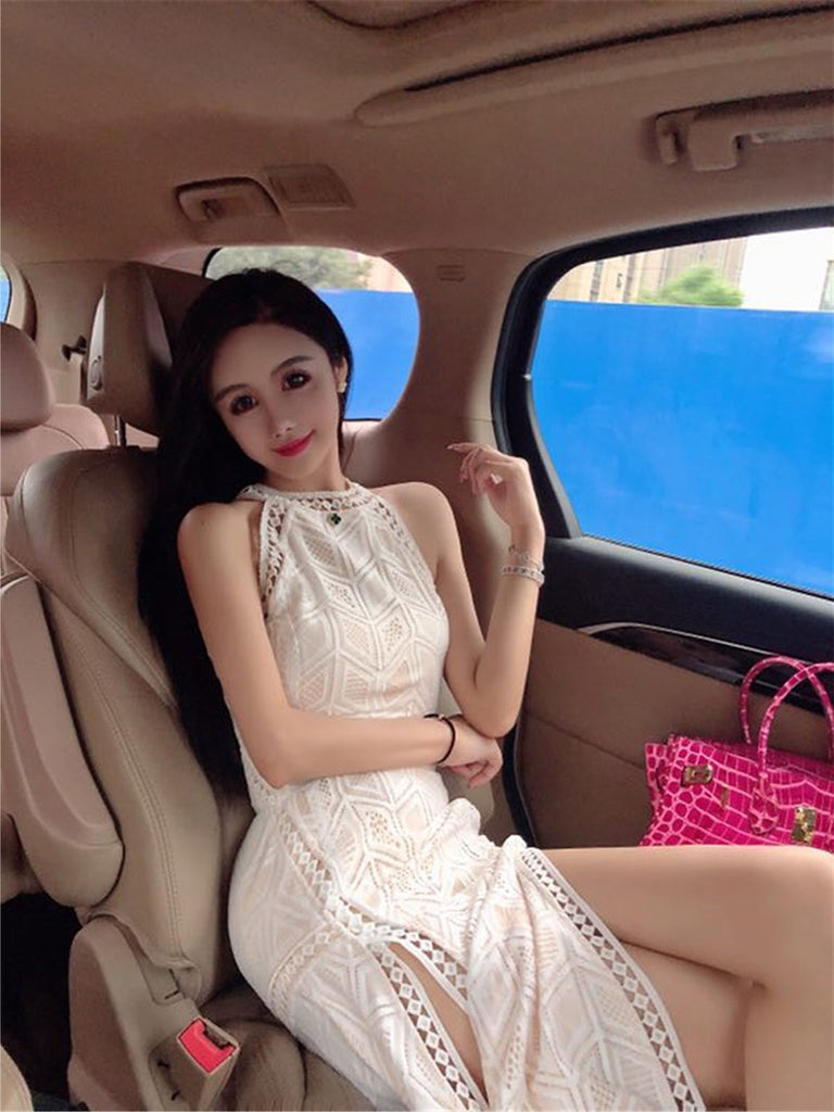 Spring Summer Temperament Angel Cut Shoulders Sexy Split Open Back Halter Lace Dress