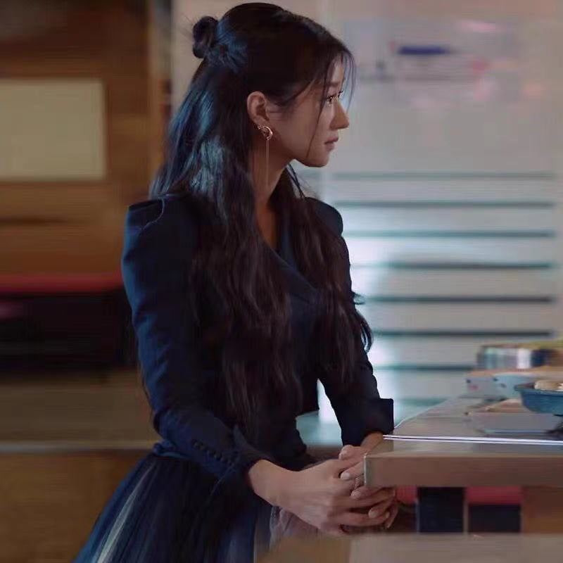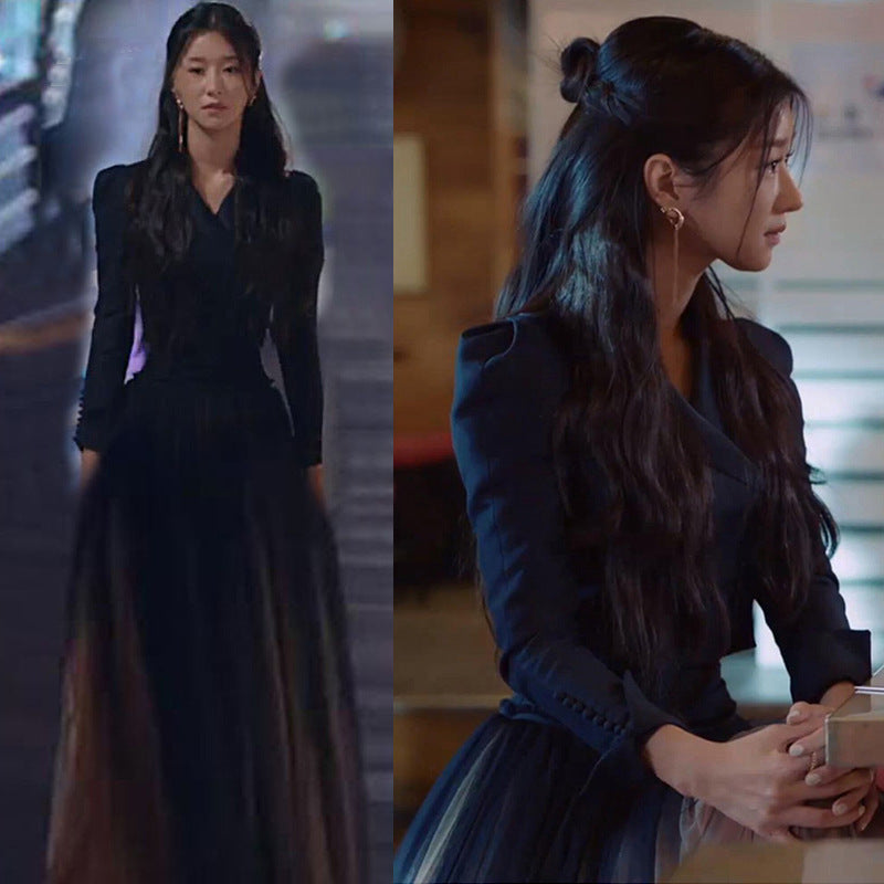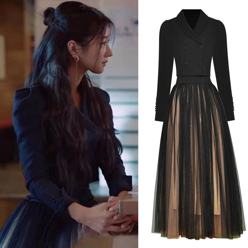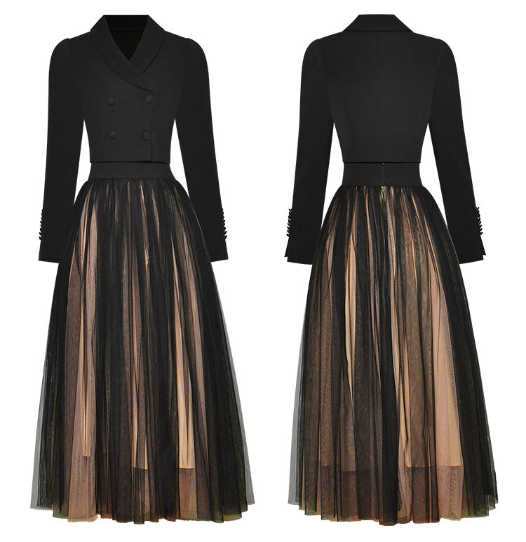 Spring Women Drama Black Fashion Suit Mesh Big Swing Skirt Dress