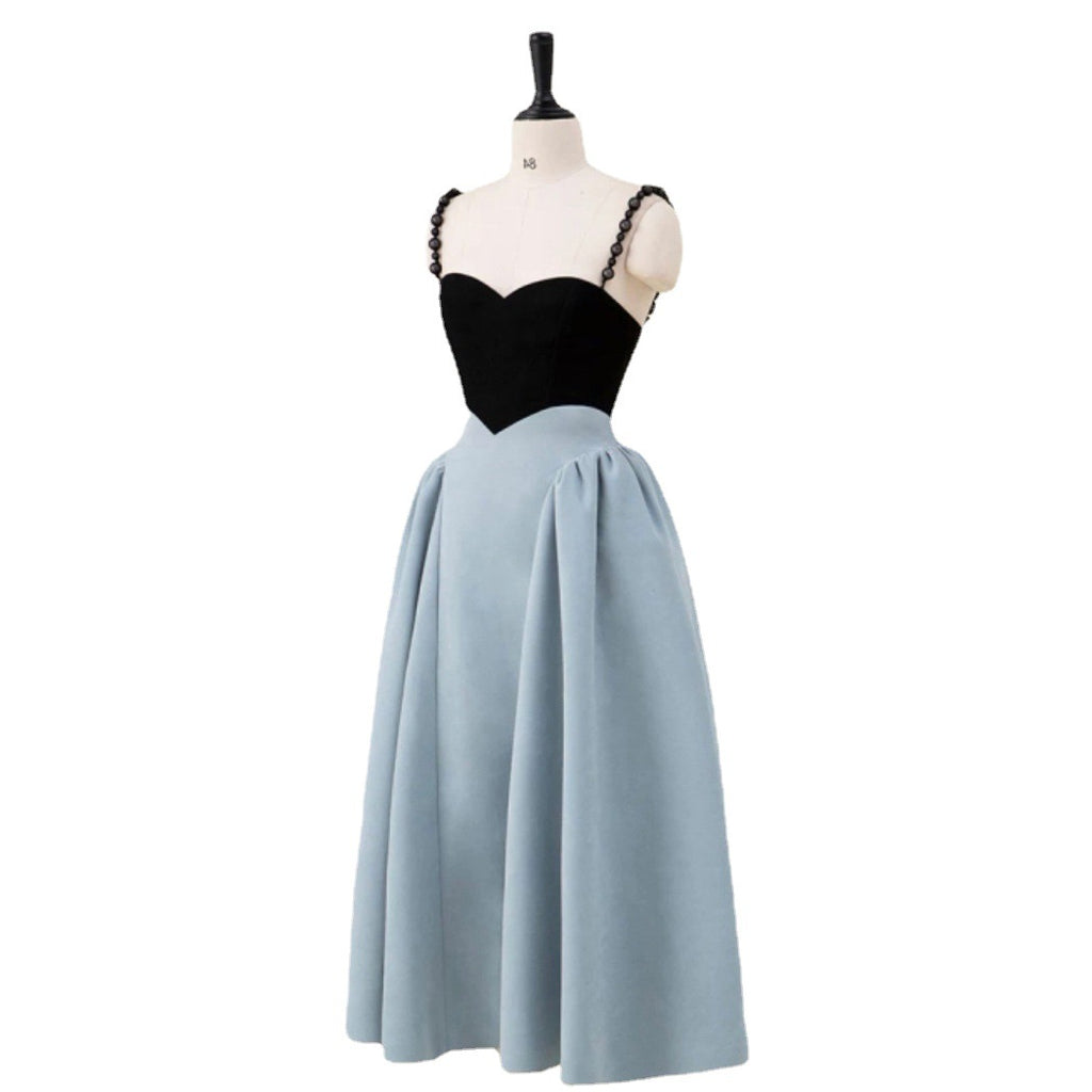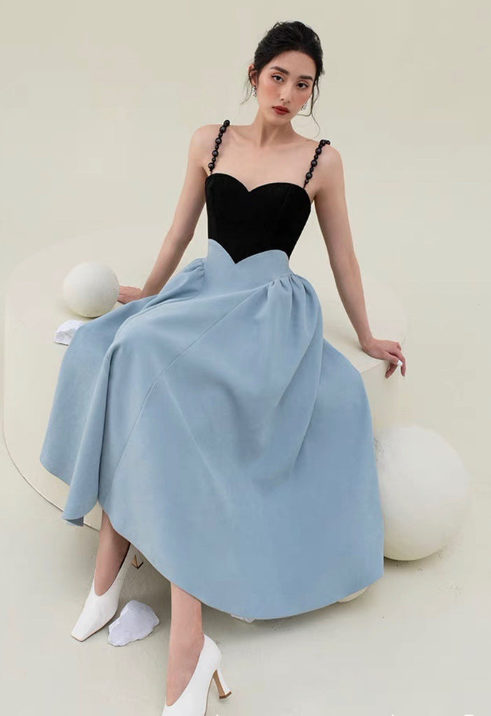 Spring Women Pearl Sling Blue Back Zipper Dress stitching big A Line skirt