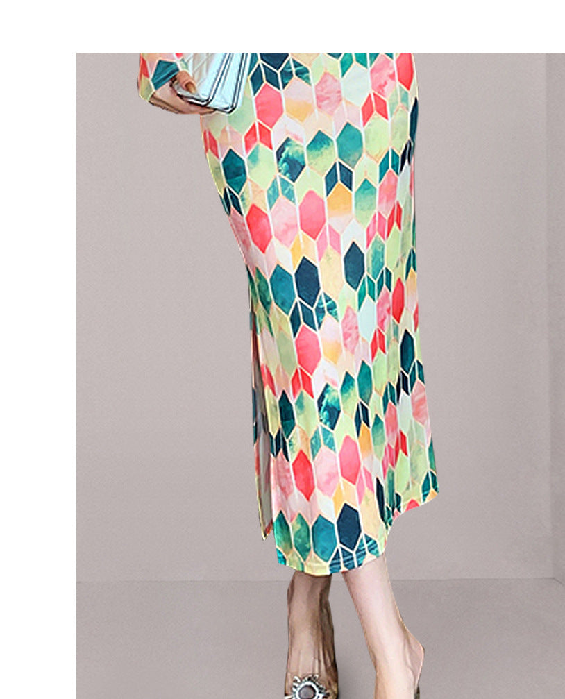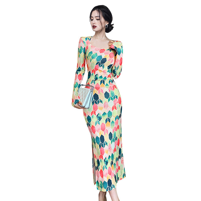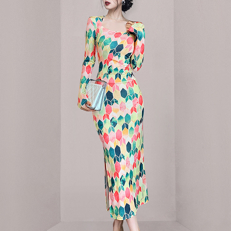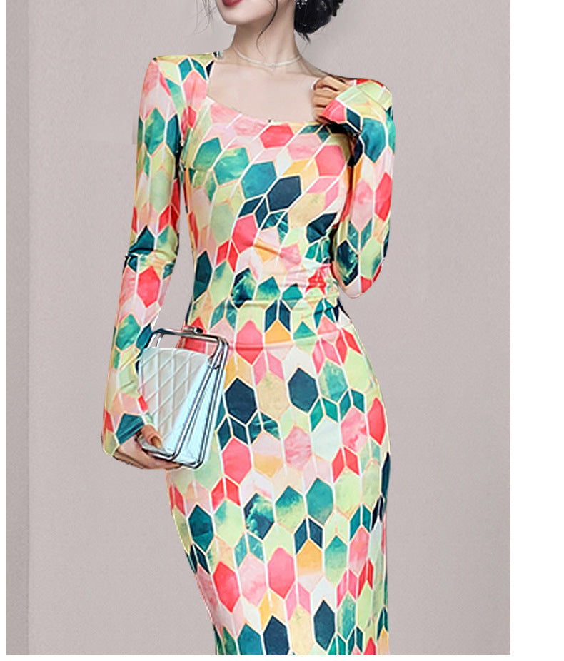 Spring Women Printed Square Collar Pencil Long Sleeves Dress