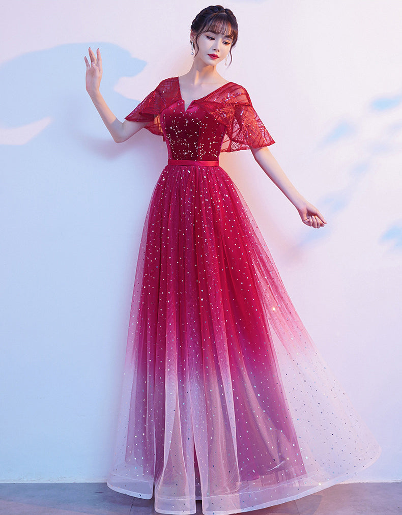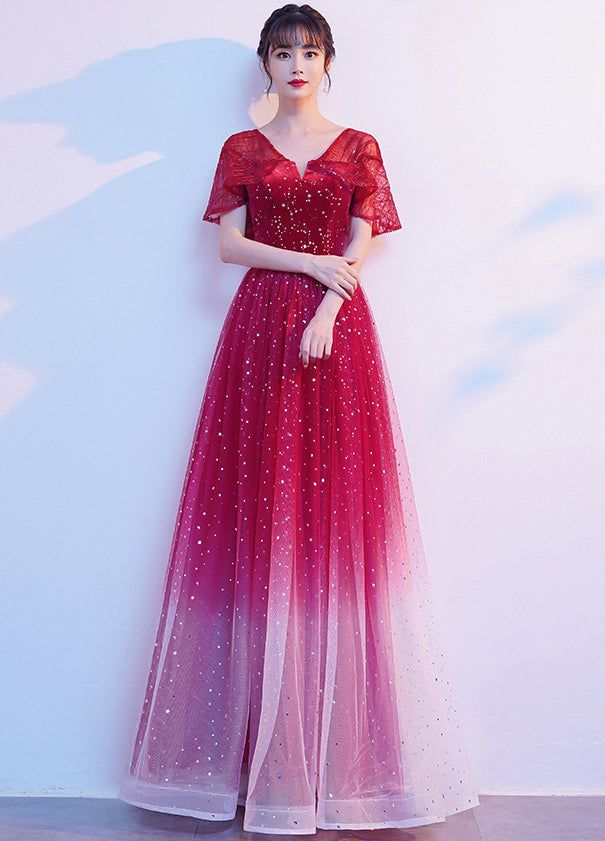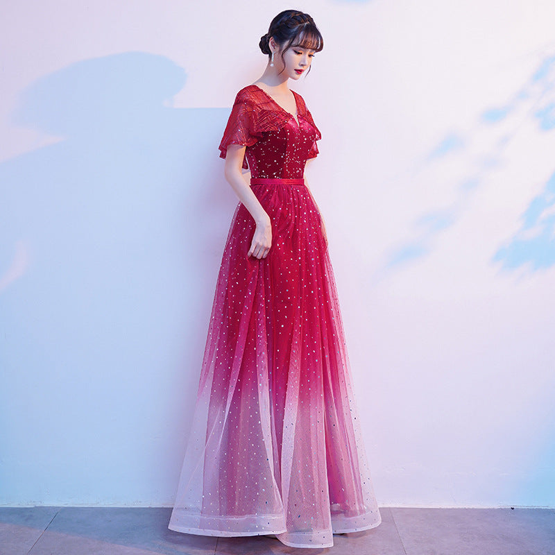 Starry Bing Gradient Color Evening Meeting Banquet Wedding Party Bride V Neck Princess A Line Dress Skirt