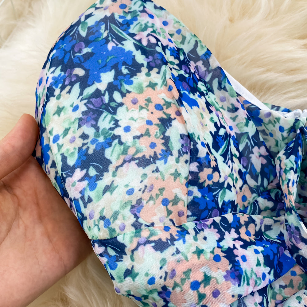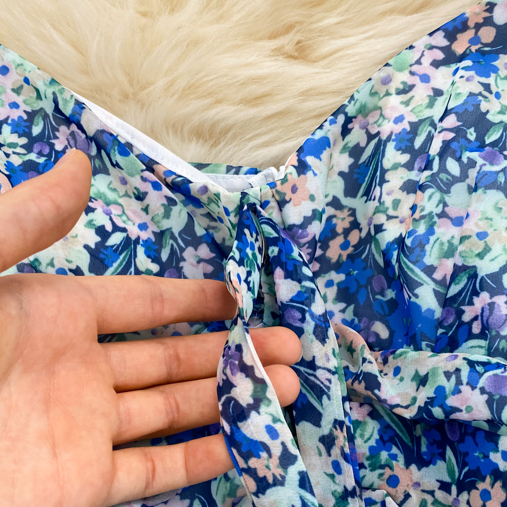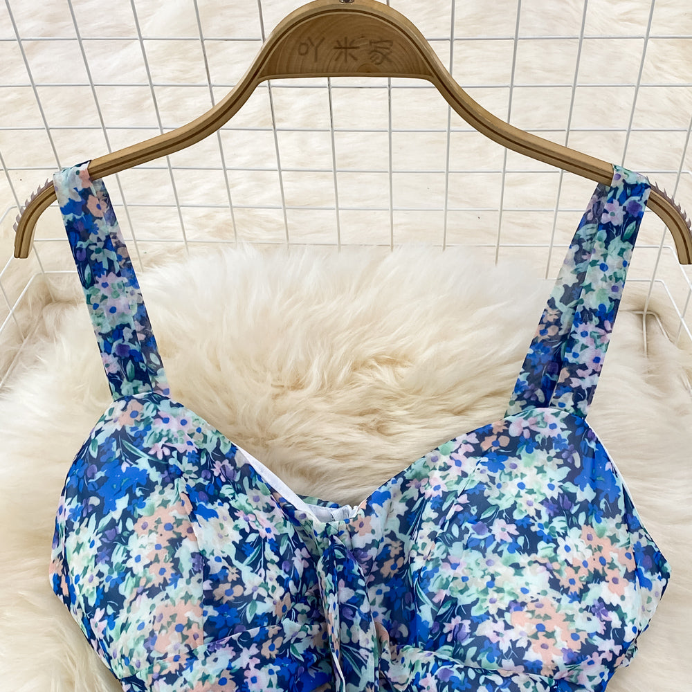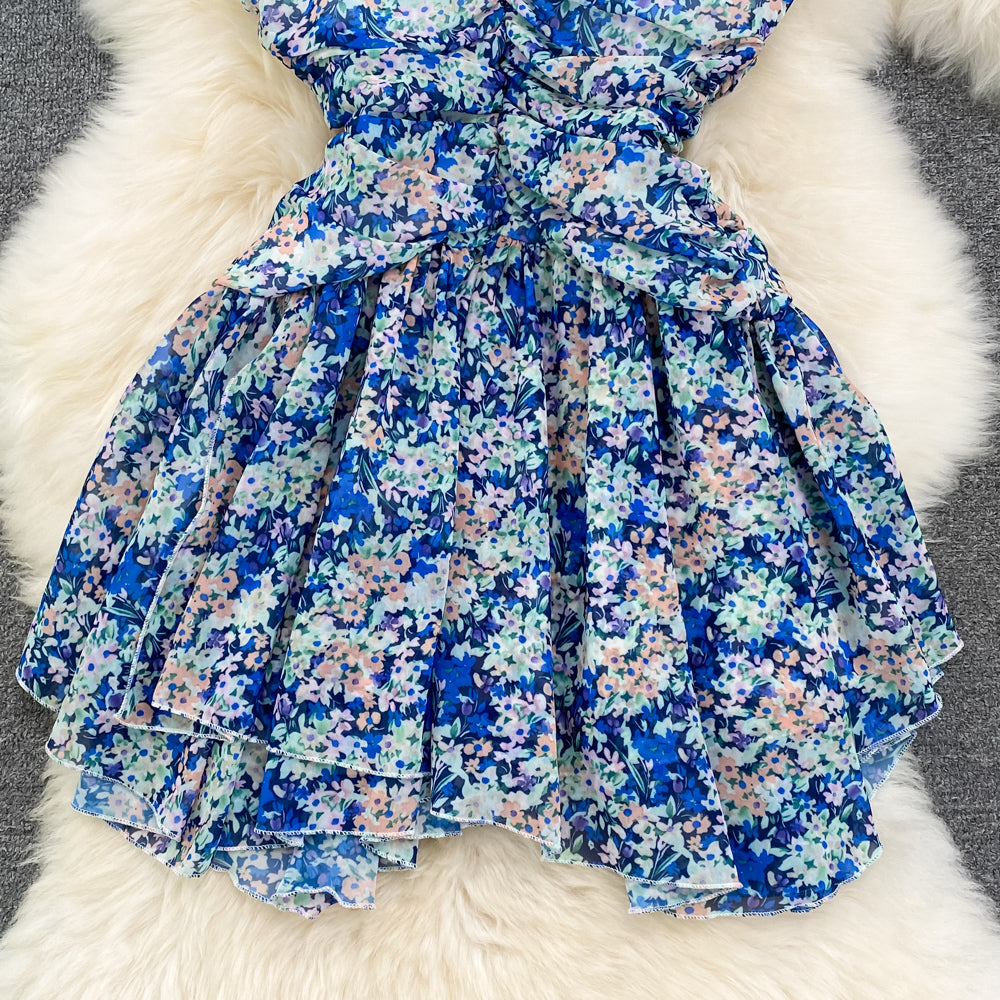 Summer Charm Women Fashion Chiffon Sleeveless Floral Spaghetti Strap Ruched High Waist A Line Puffy Dress
