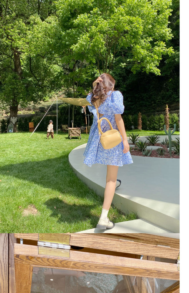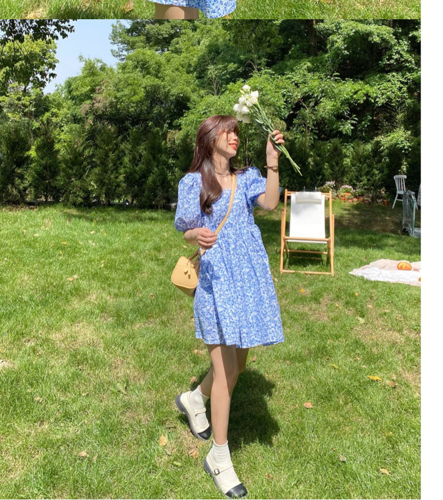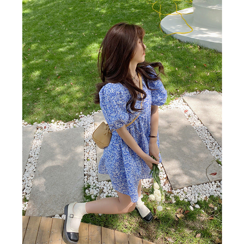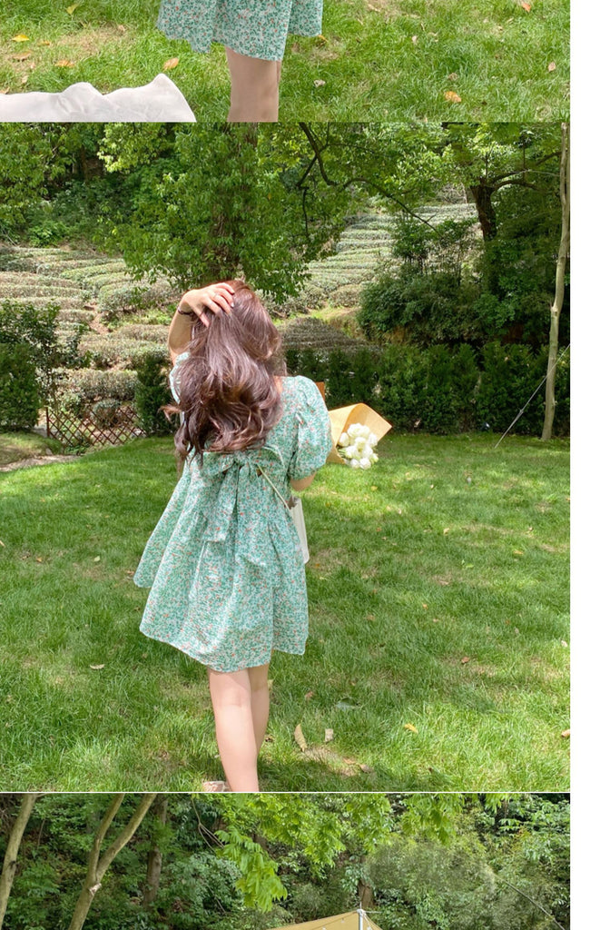 Summer Chic Women Tea break High Quality Retro Waist Floral Puff Sleeve Floral Drawstring Dress Dresses