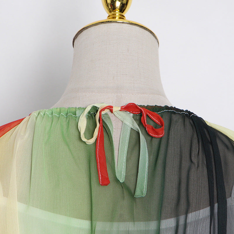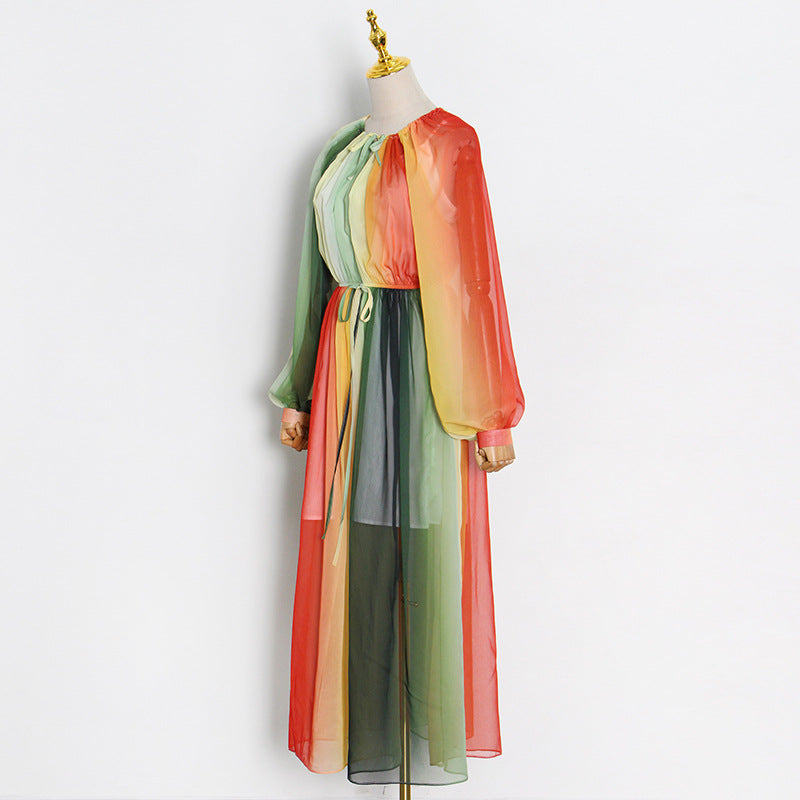Summer Elegant Women Colorful Rainbow Round Neck Chiffon Lantern Sleeves High Waist Big Swing Long Dress