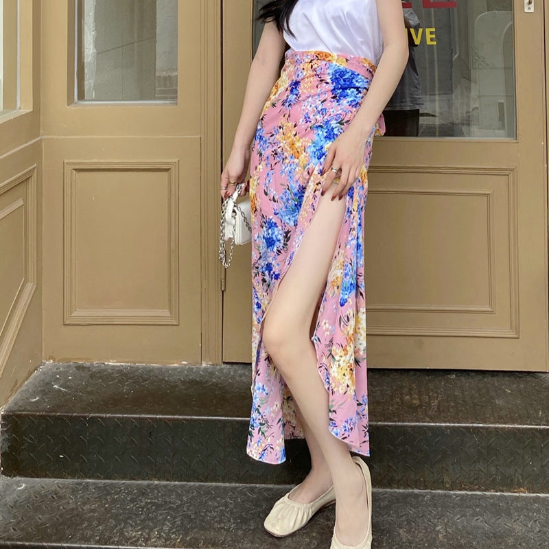 Summer Holiday Sunscreen Beach Chiffon Pink Paint Dye Printed Lace Up One Piece Wrap Side Slit Skirt