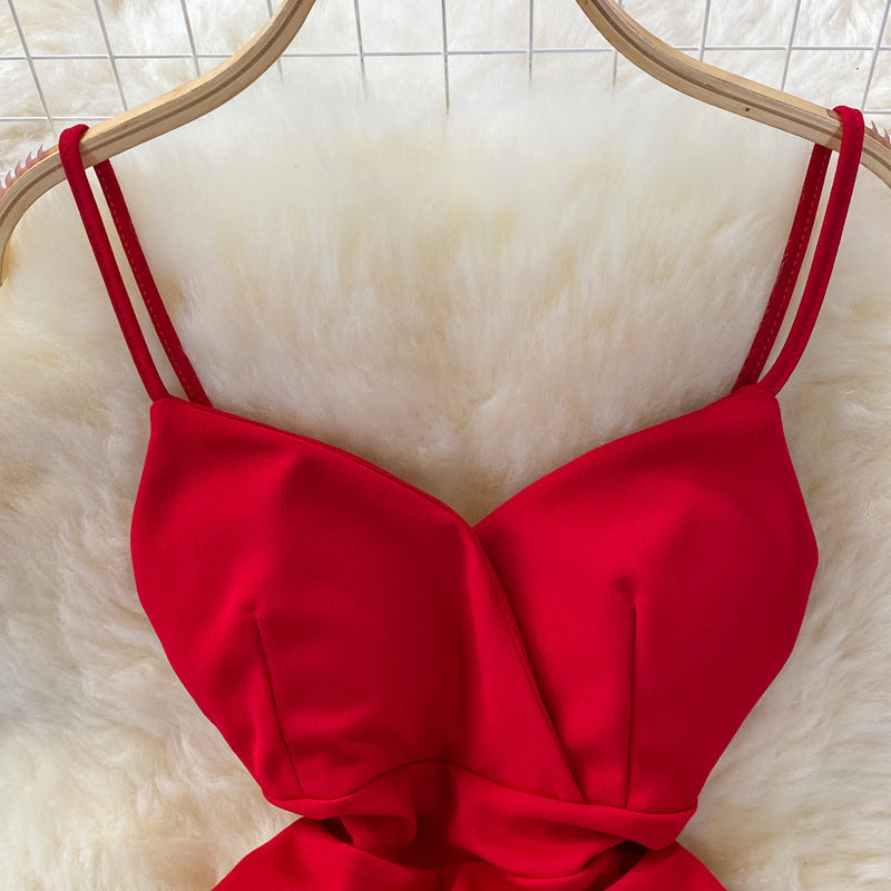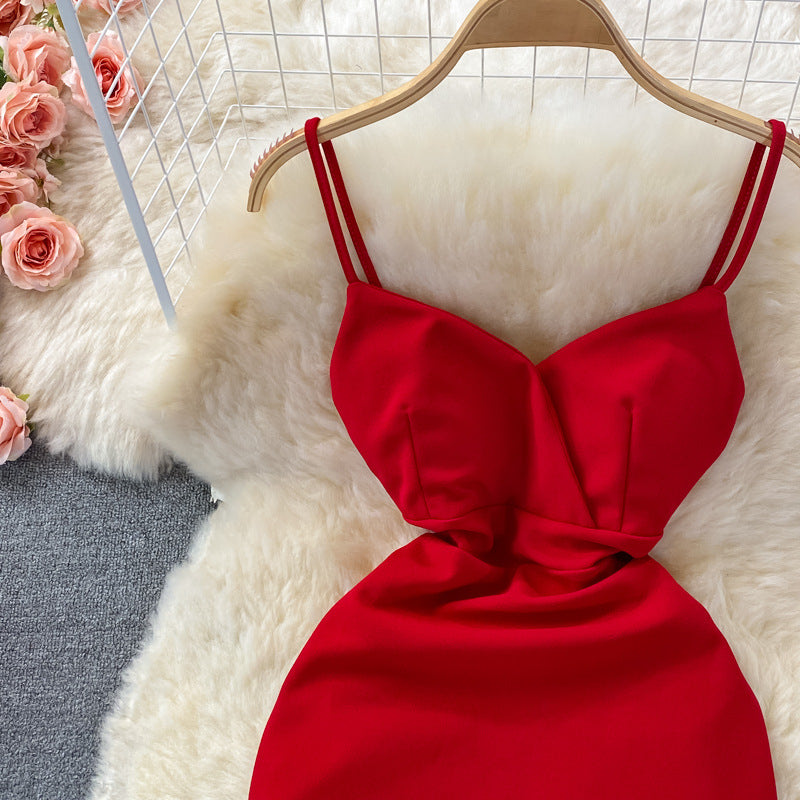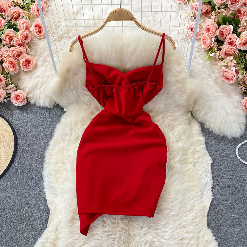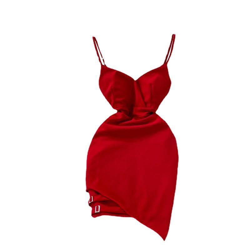 Summer Temperament Women Sleeveless Backless V Neck Spaghetti Strap Irregular Hip Buckle Design Mini Dress