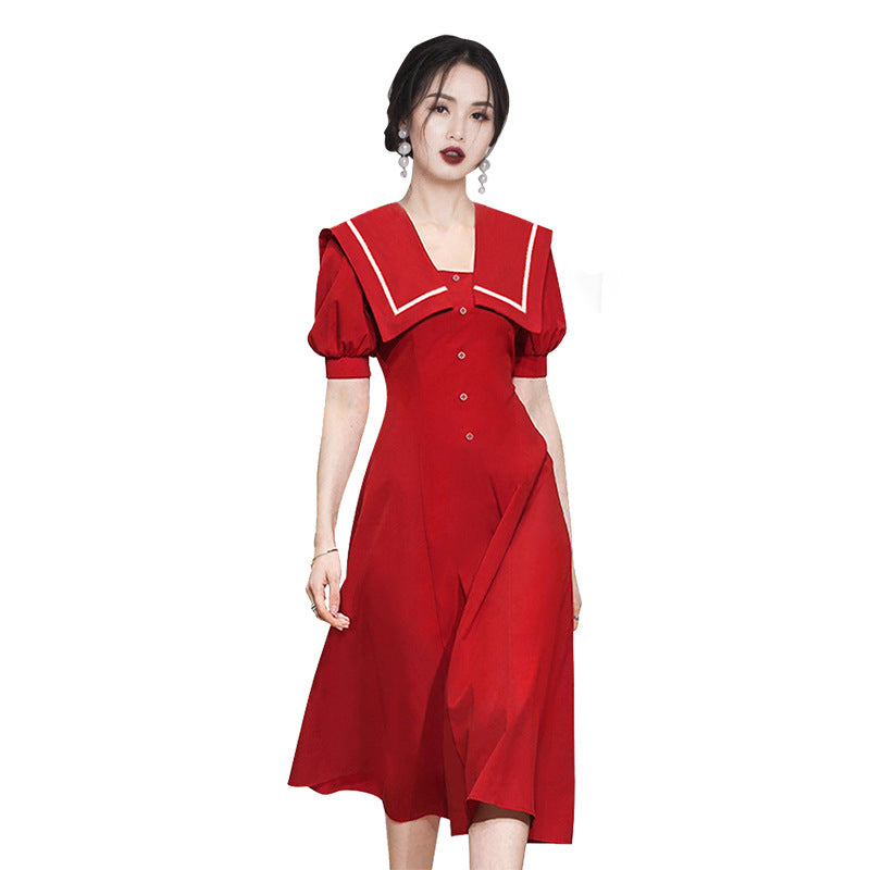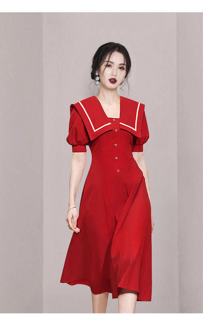 Summer Women Sailor Navy Style Red Collar Large Lapel High Waist Big Swing Dress