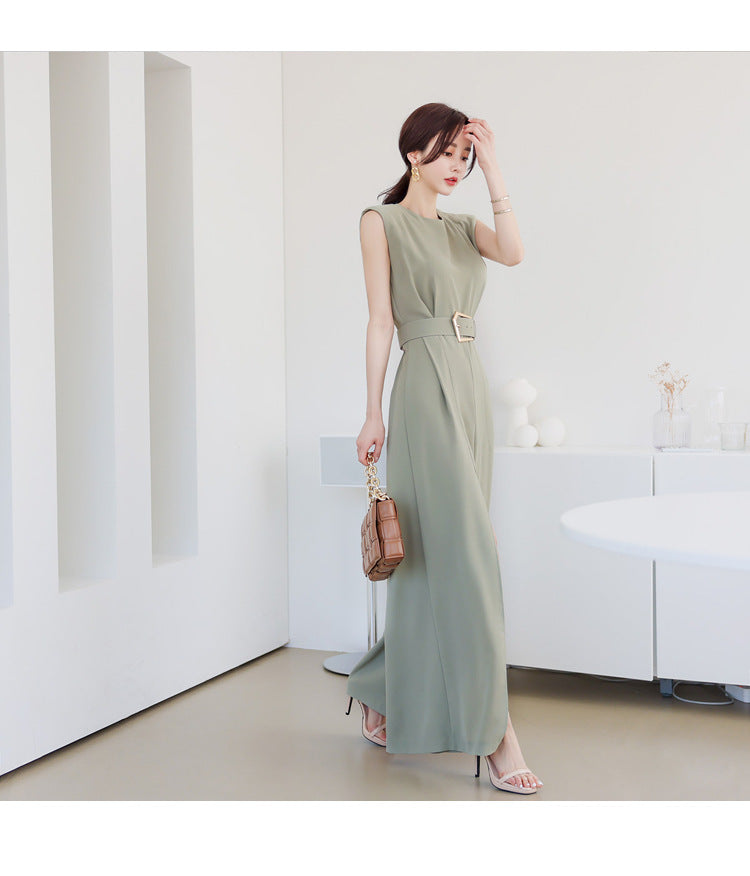 Summer Women Temperament Waist Slit Wide Pants One Piece Jumpsuits with belt
