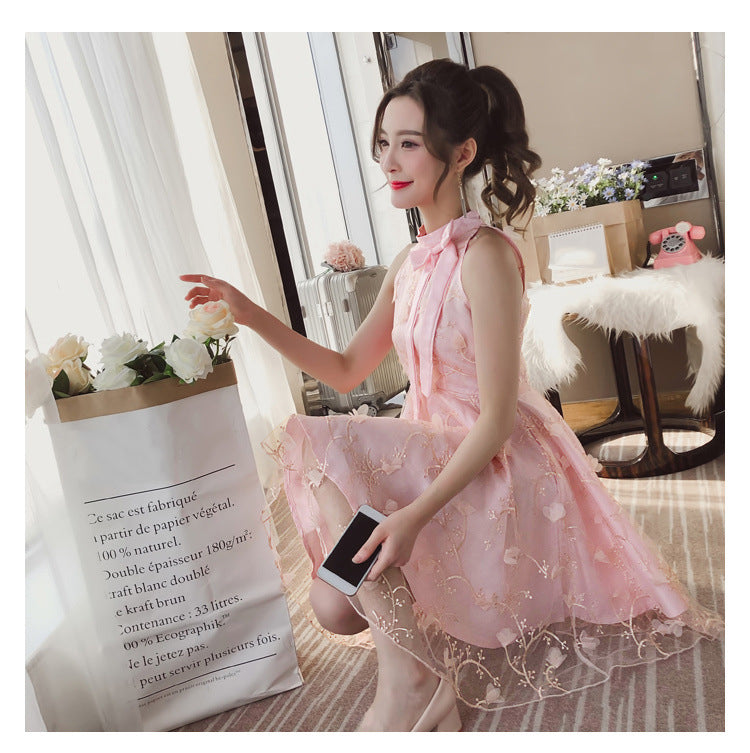 Sweet Princess Fairy Women Floral Embroidery High Waist Neck Bow Mesh Pleated Tutu A Line Dress