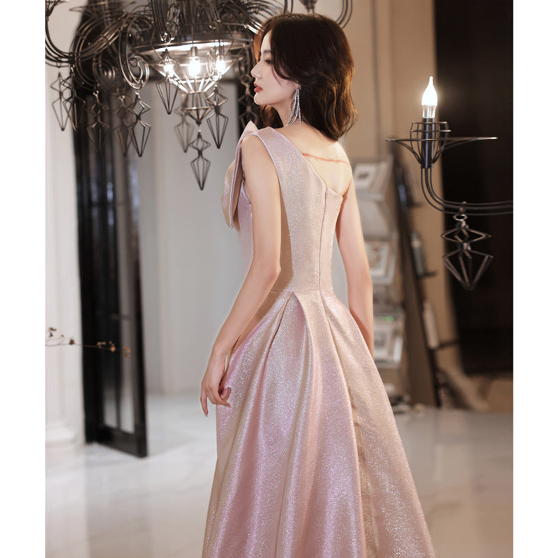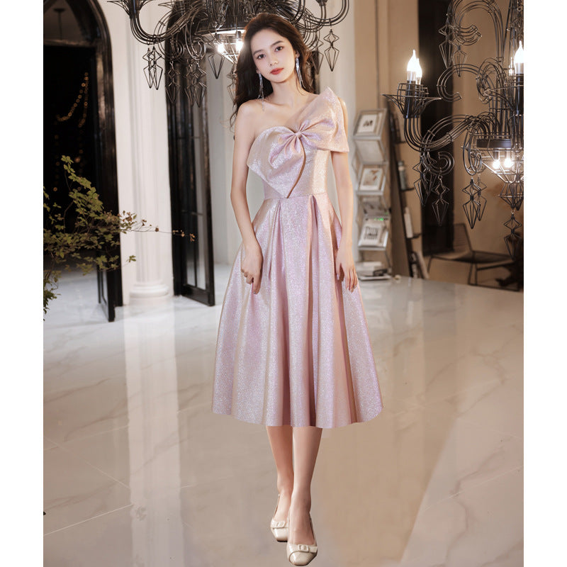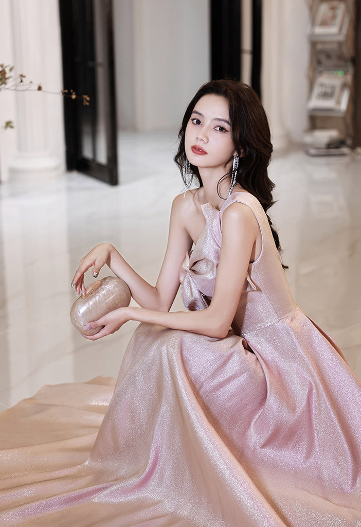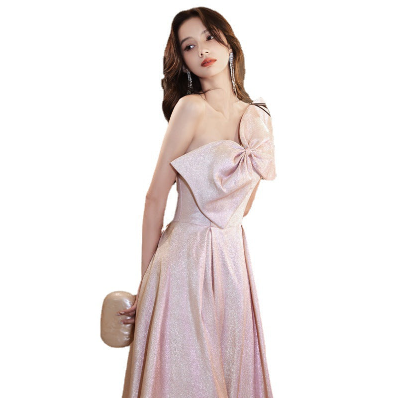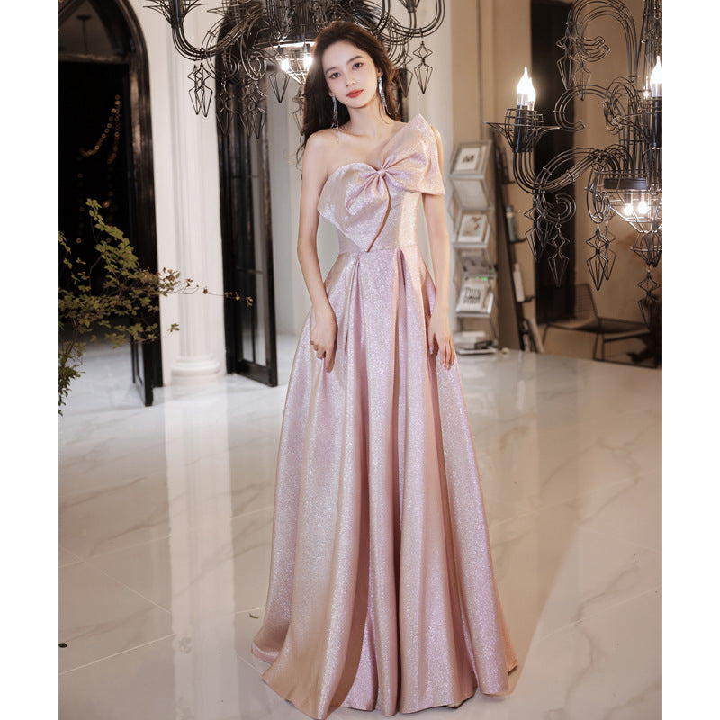 Temperament Chic Ladies Pink One Shoulder Big Bow Sleeveless Banquet Evening Prom Long Dress