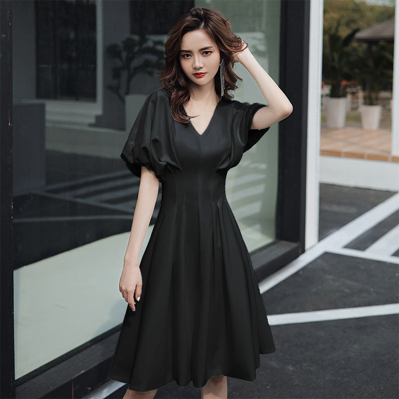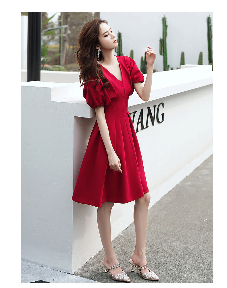 Temperament Fashion Elegant Women Wine Red Solid Color V Neck Puff Short Sleeves Bride Evening Party A Line Dress