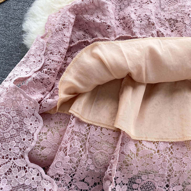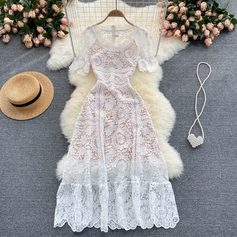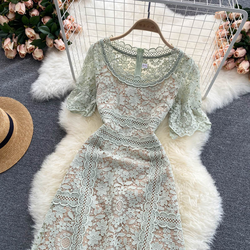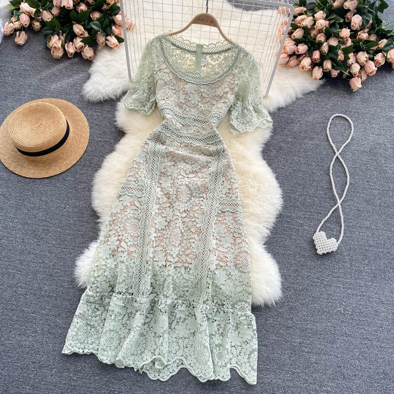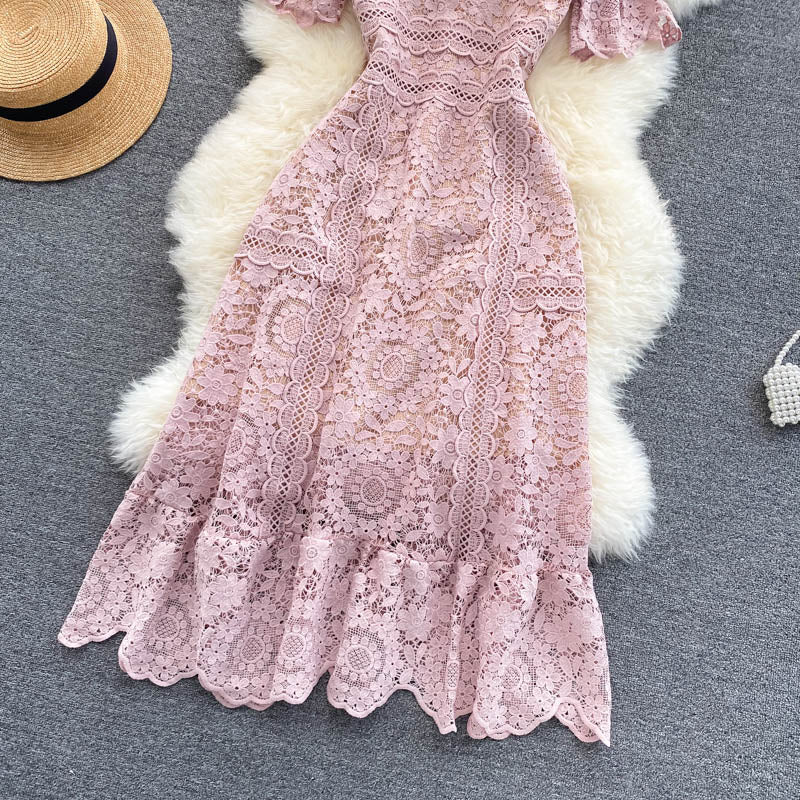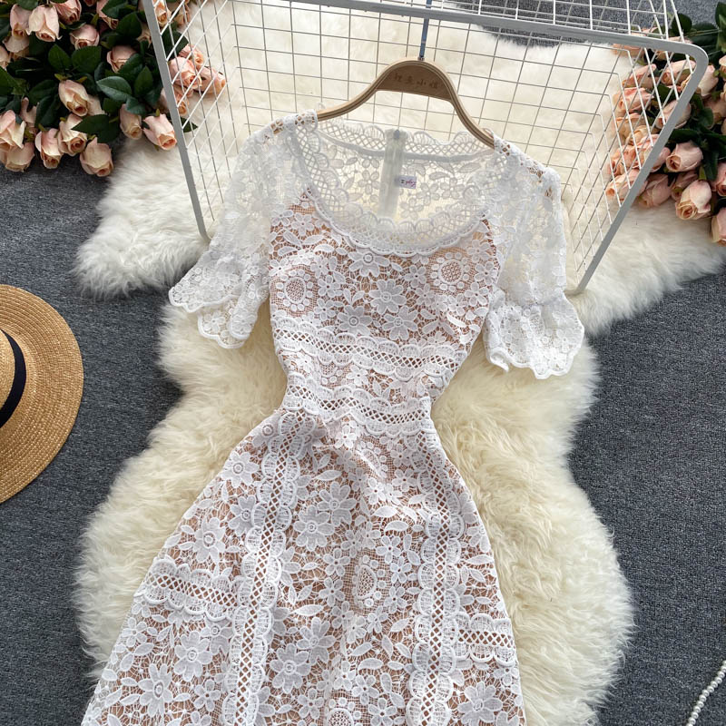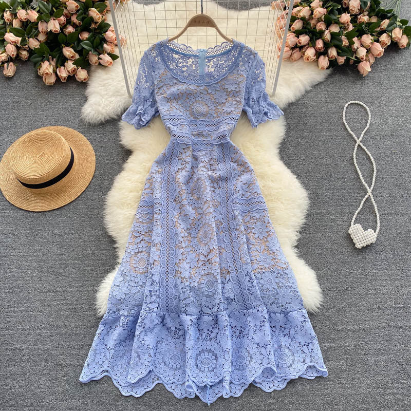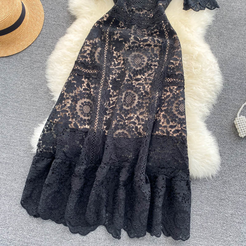 Temperament Luxury Summer Women Hollow Round Neck Floral Lace Short Sleeves Ruffled Dress