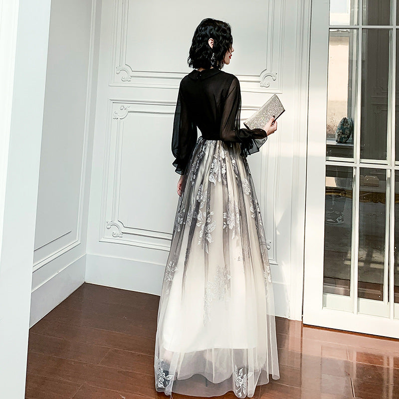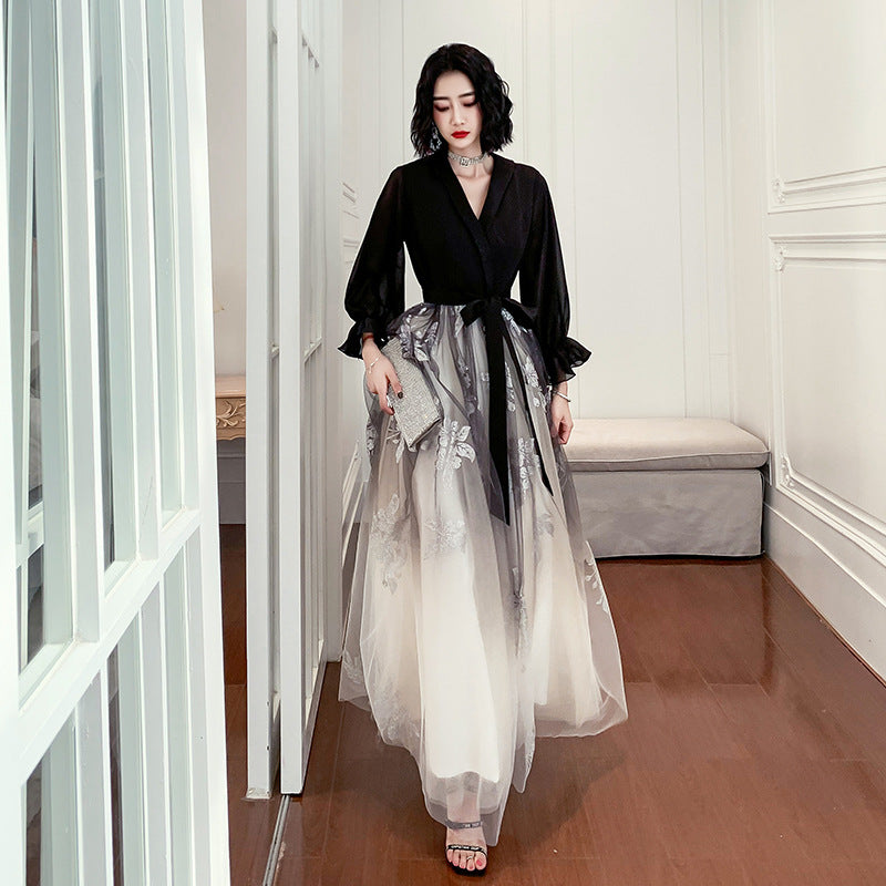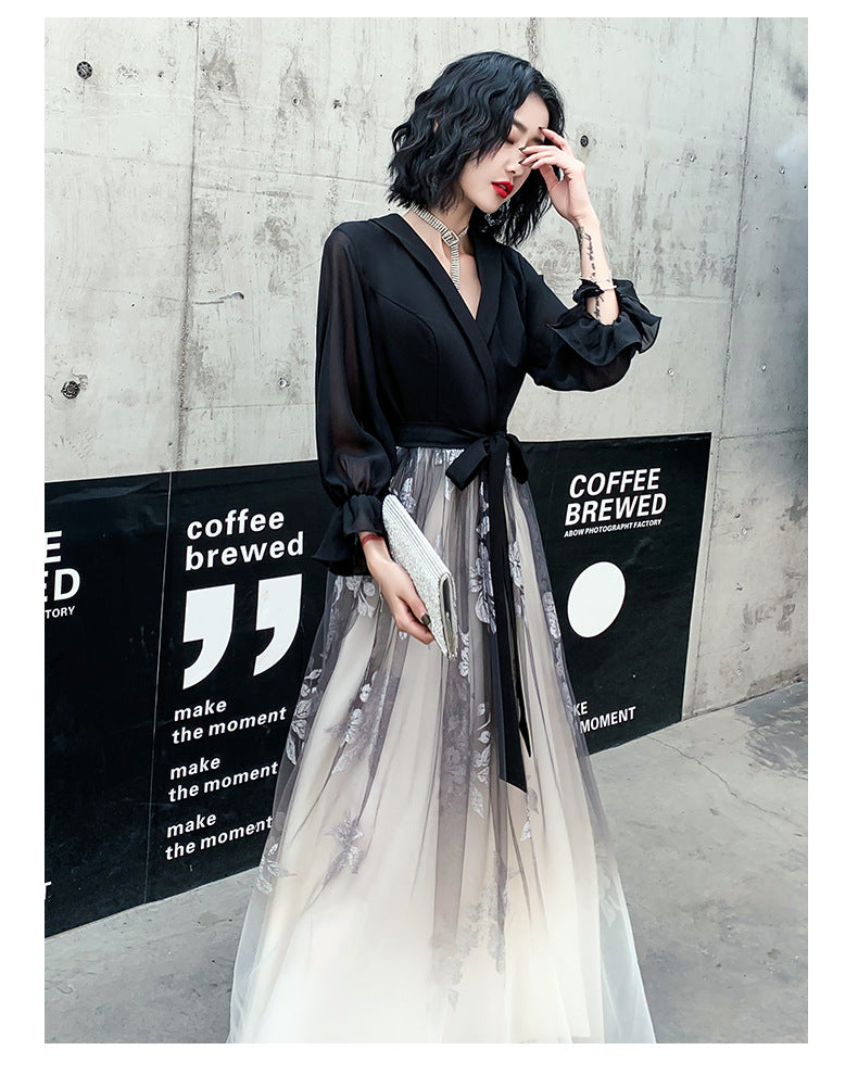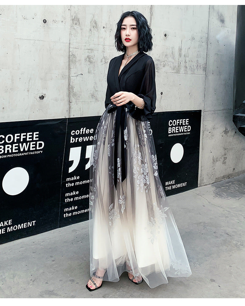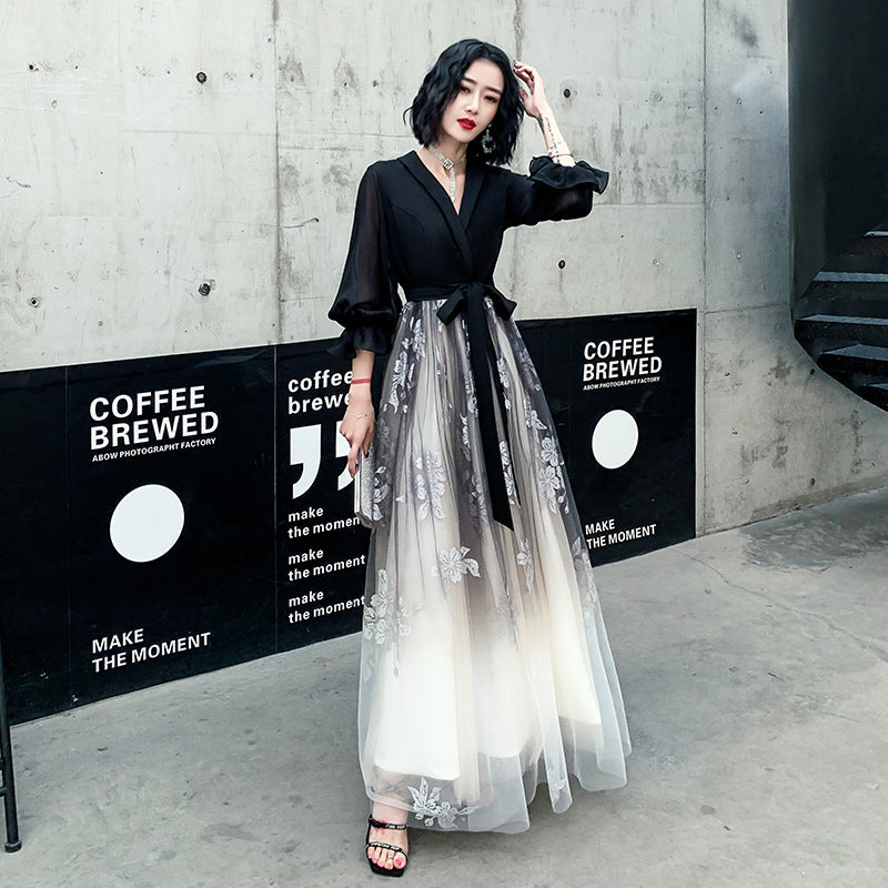 Temperament Plus Size Women Black Ombre Color Gradual Change V Neck High Waist Meeting Evening Pleated Dress