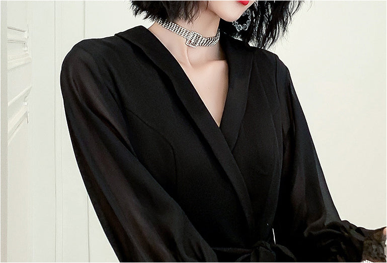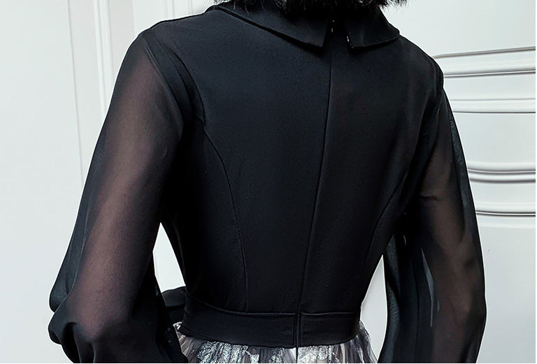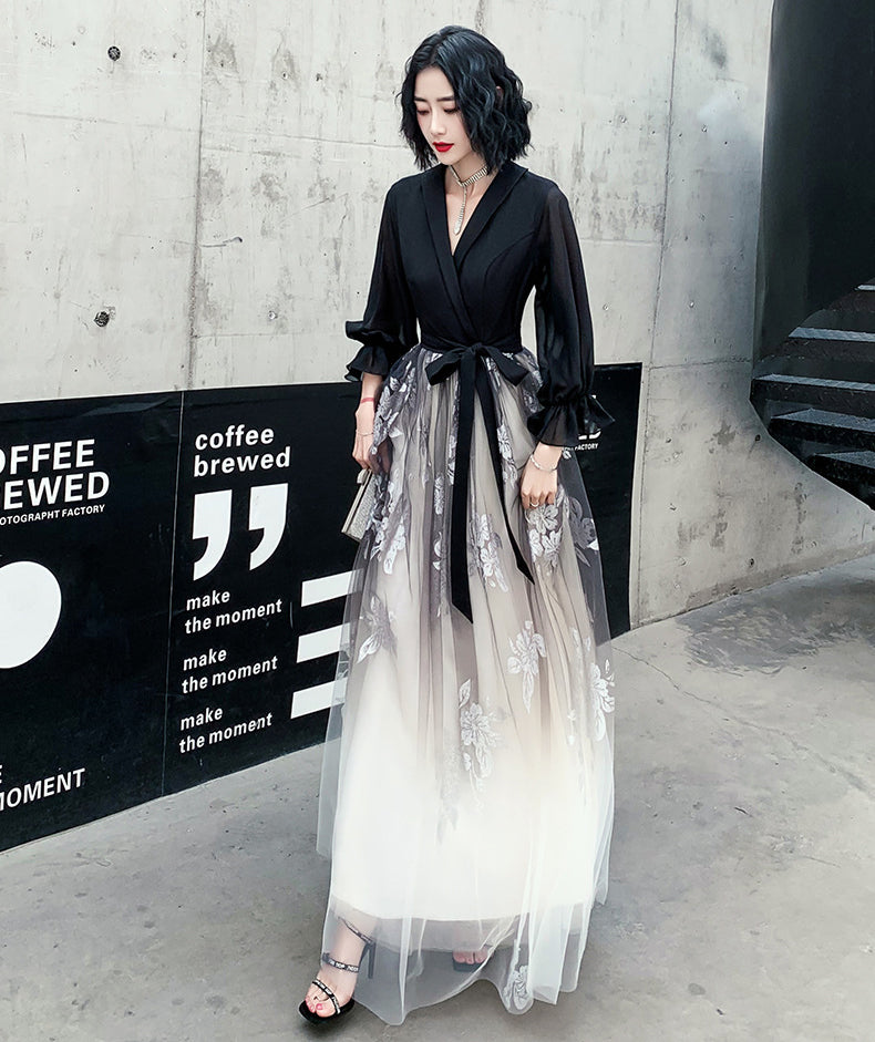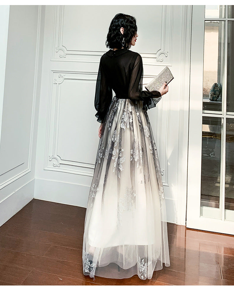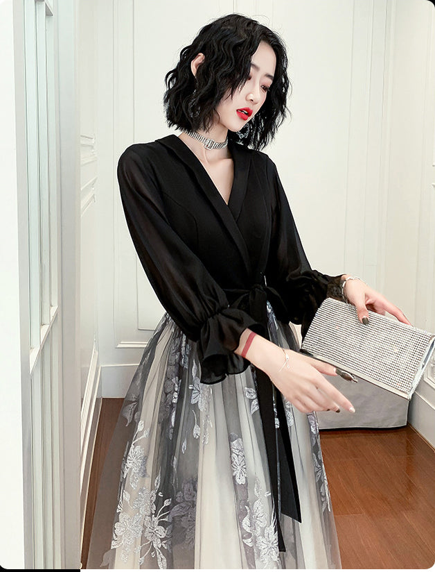 Temperament Plus Size Women Black Ombre Color Gradual Change V Neck High Waist Meeting Evening Pleated Dress