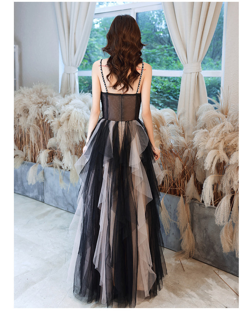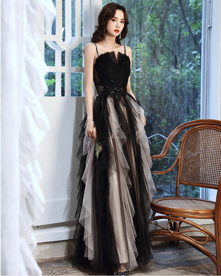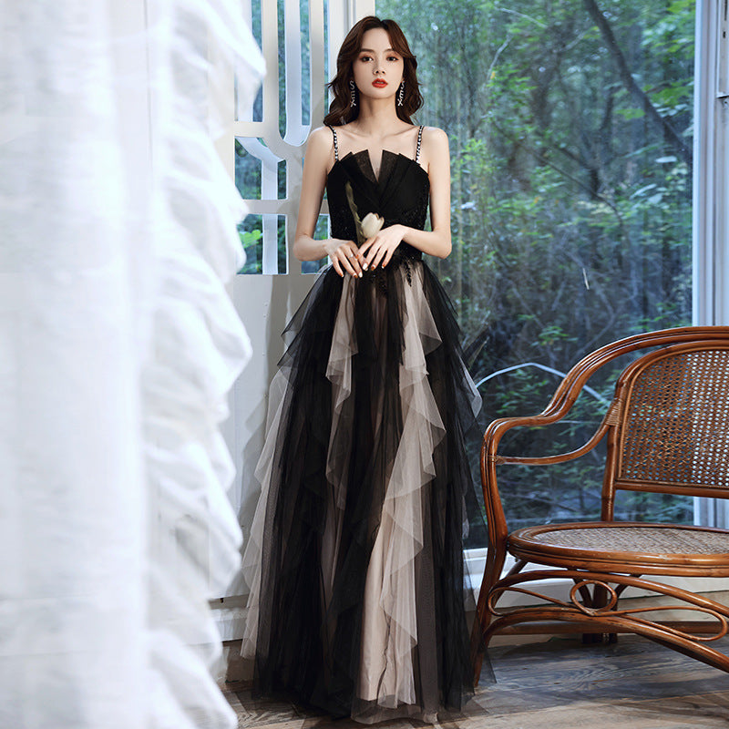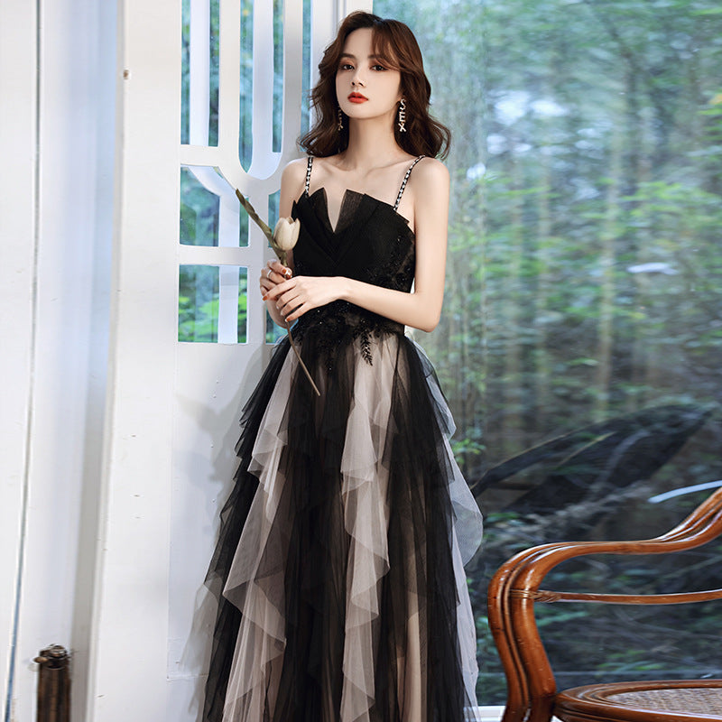 Temperament Princess Spaghetti Straps Beading Sequins Lace Sleeveless Backless Long Black Ruffle Prom Dresses Dress