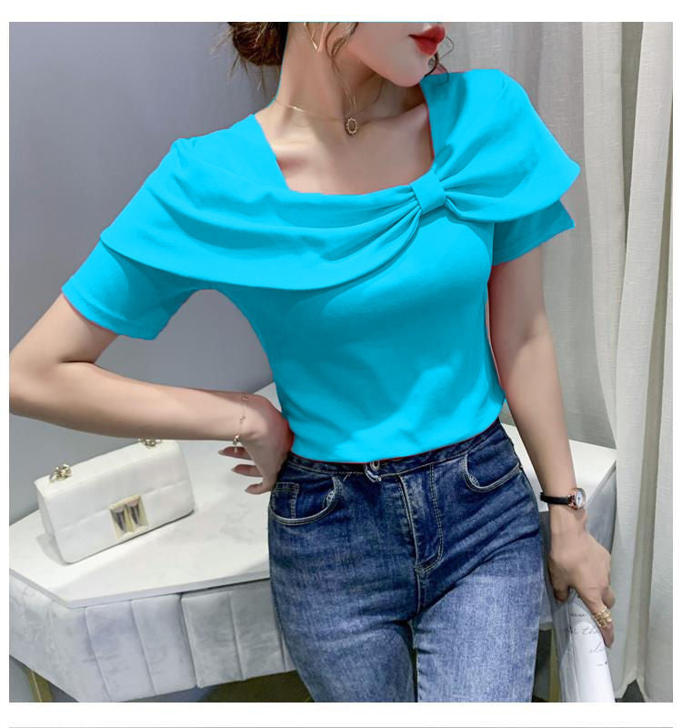 Temperament Summer Women Ladies Trendy Fashion Colorful Solid Color Square Neck Short Sleeved Big Bow Short Sleeves Top Shirt