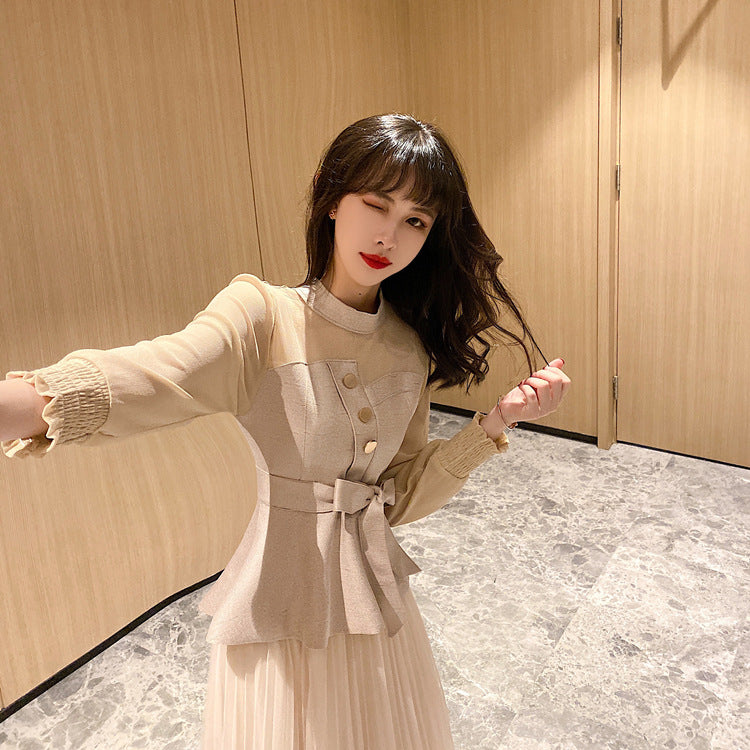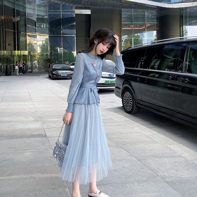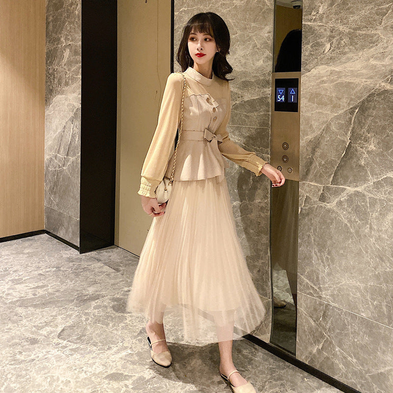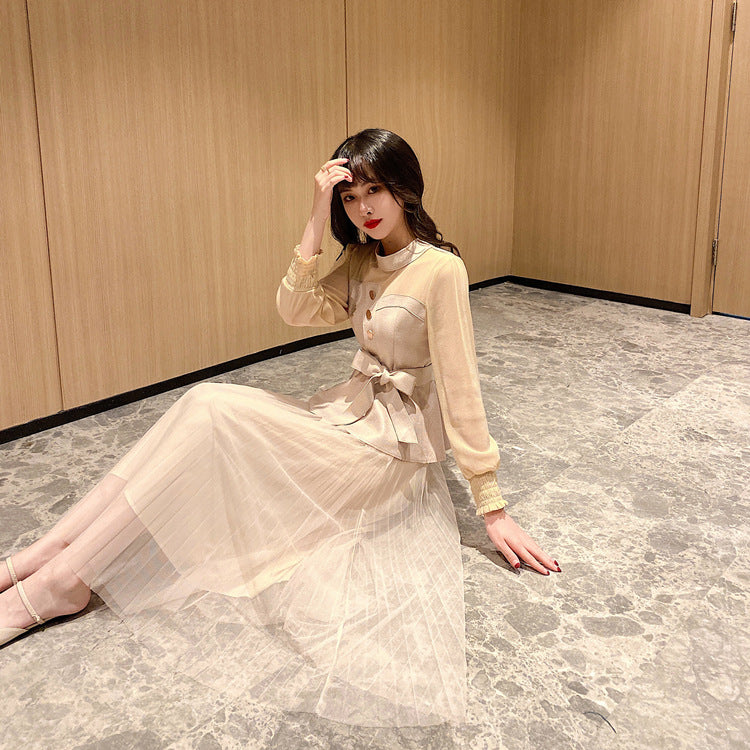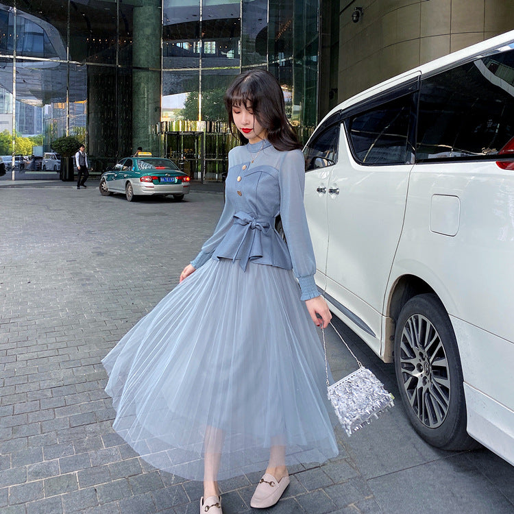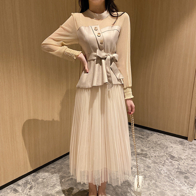 Temperament Two-piece Suede Stitching Long Sleeve Top Large A Pleated Mesh Skirt