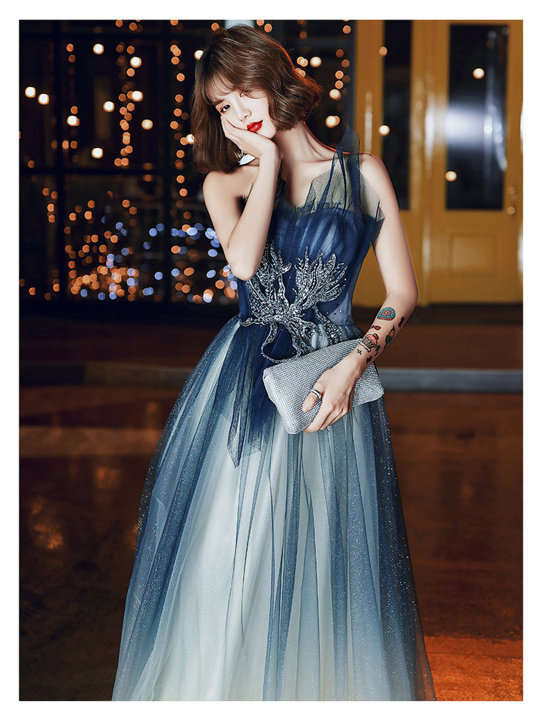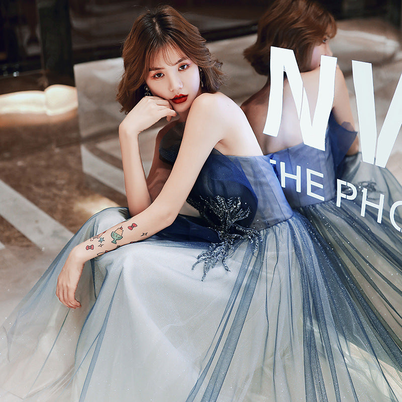 Temperament Women Princess Banquet Sparkle Embroidered Gradient Navy Blue Backless Tube Top High Waist Evening Long Dress