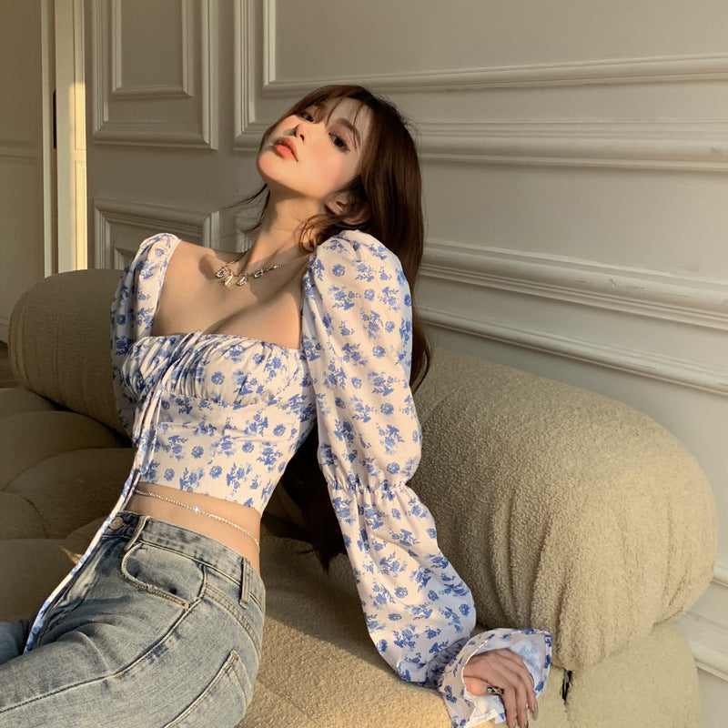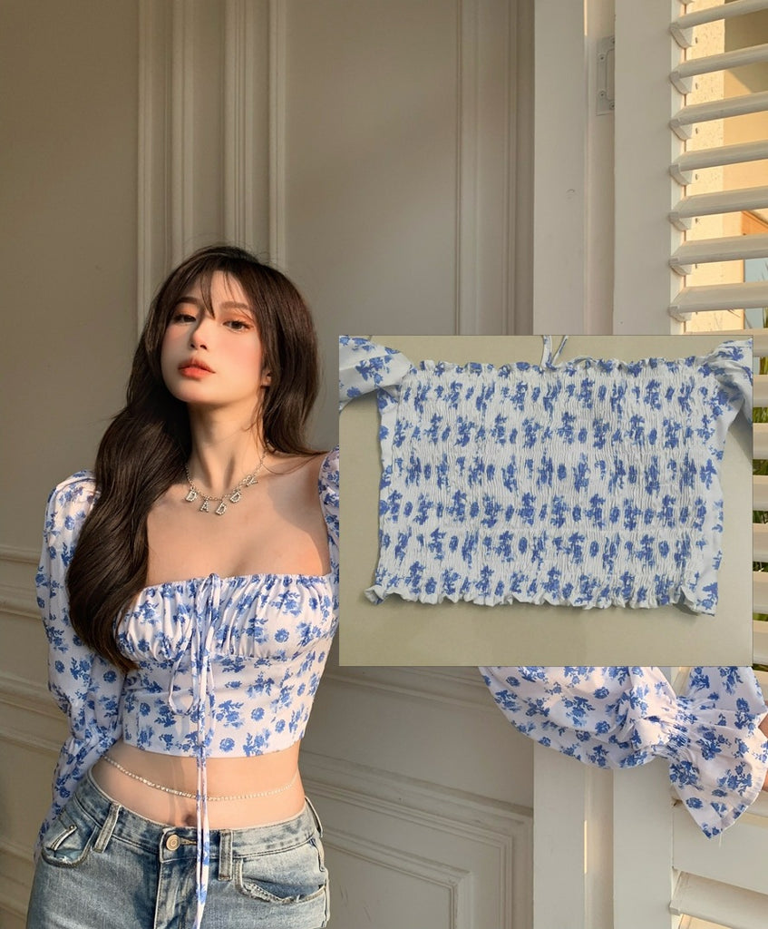 Pattern: Floral Printed, Puff Long Sleeves, Crop Top Blouse