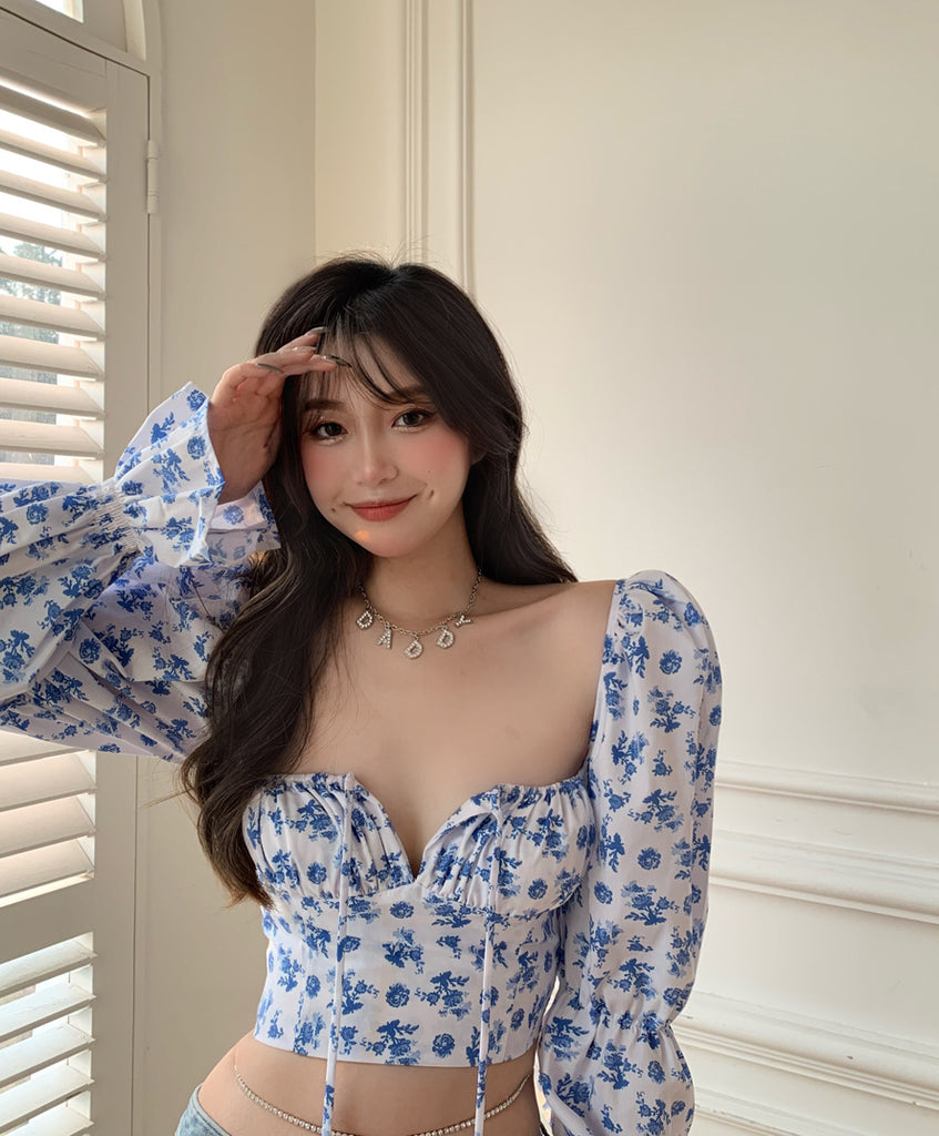 Trendy Fashion Summer Women Blue Sexy Floral Printed Puff Long Sleeves Tie Bow Deep V Neck Crop Tops