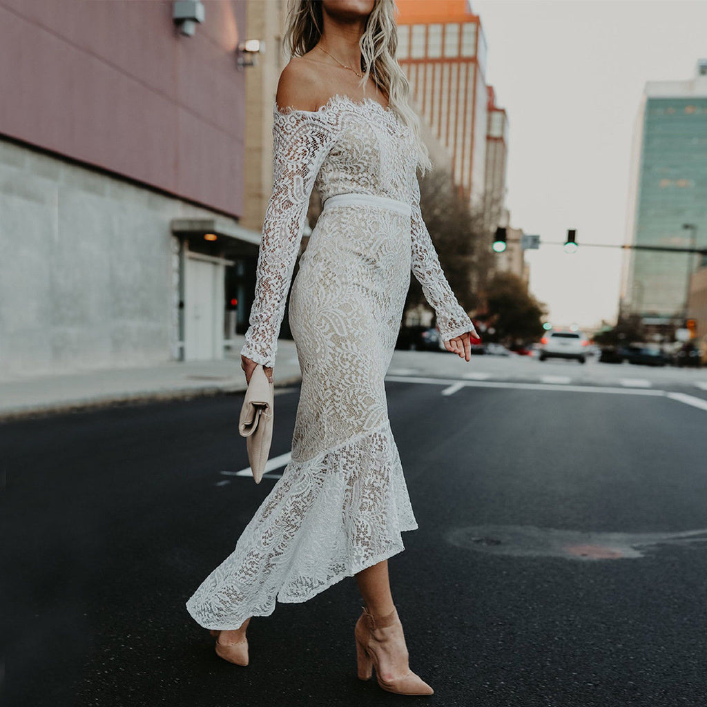 Elegant women off shoulder long sleeve full-lace slim fit dress.