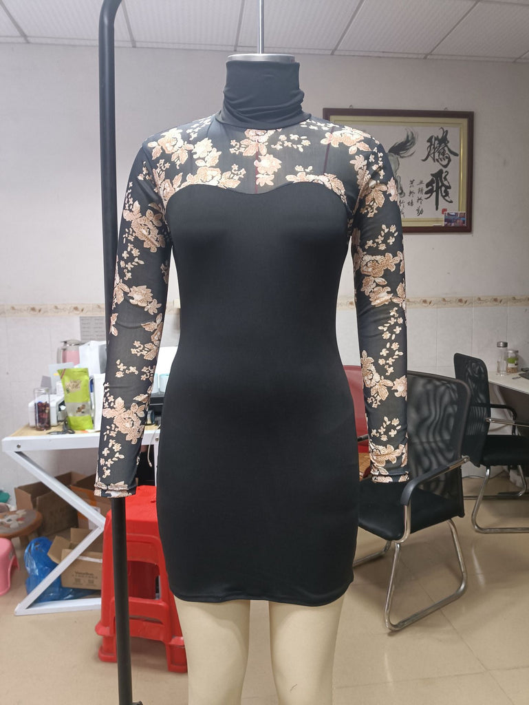 Women Hip Sequins Floral Lace Stitching Black Bodycon Dress
