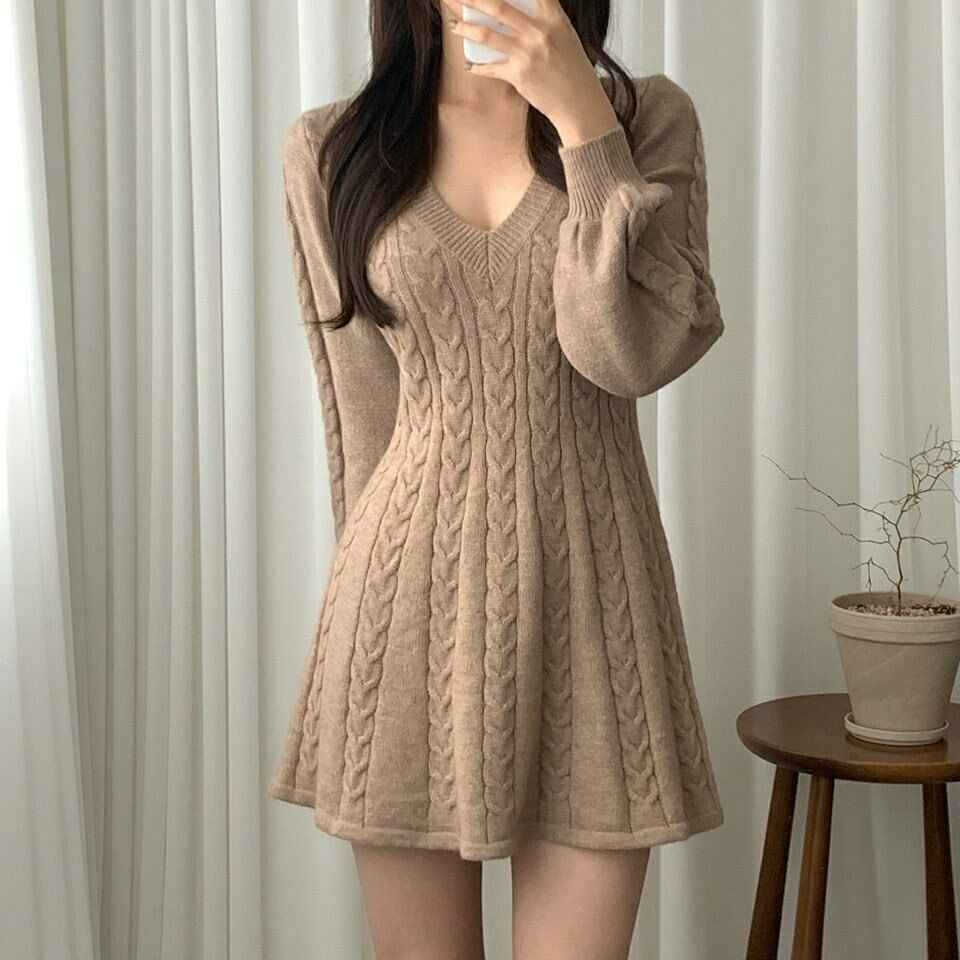 Women Trendy V Neck Long Sleeves Slim Fit Short Knitted Sweater A Line Dress