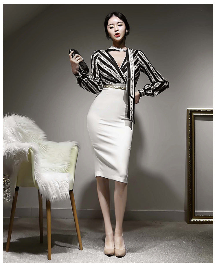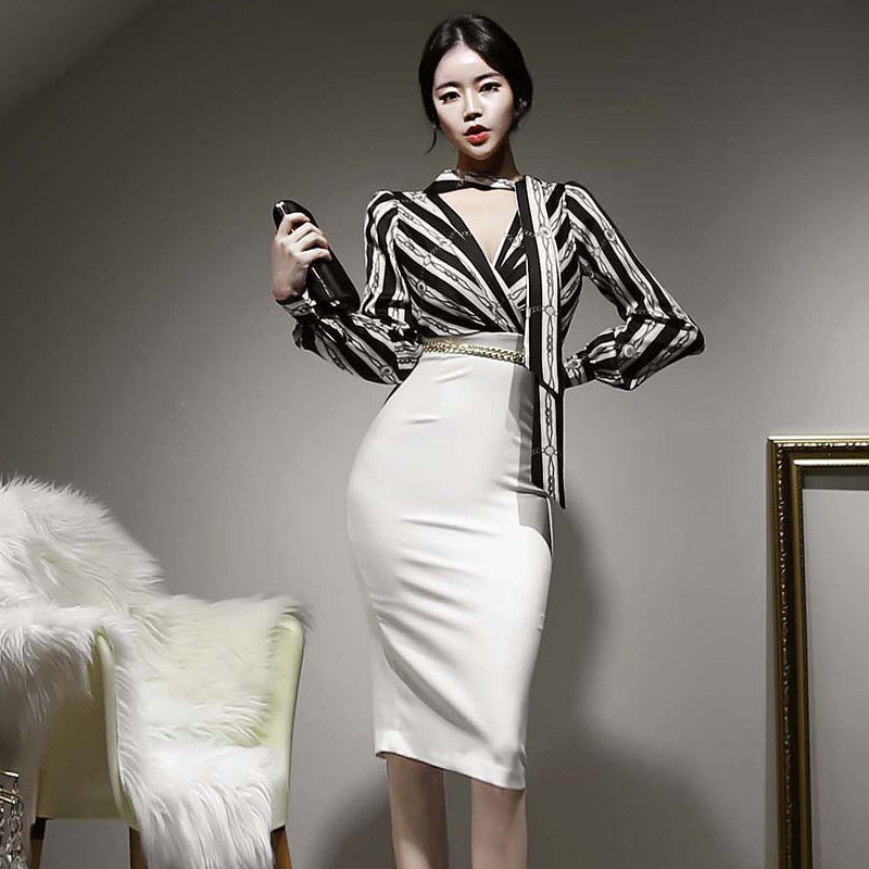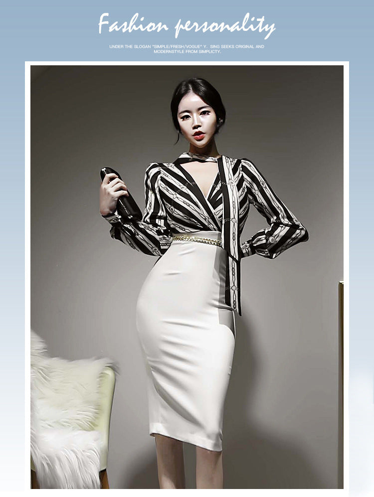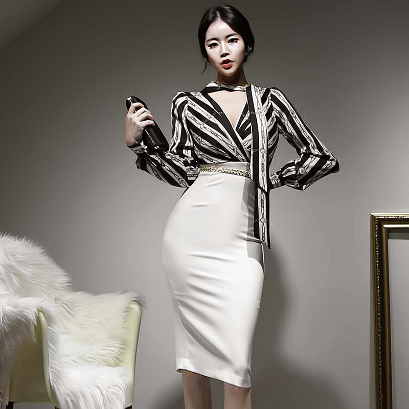 Black Striped Halter Neck Women Clothing Temperament Fit Lace Up One Piece Dress