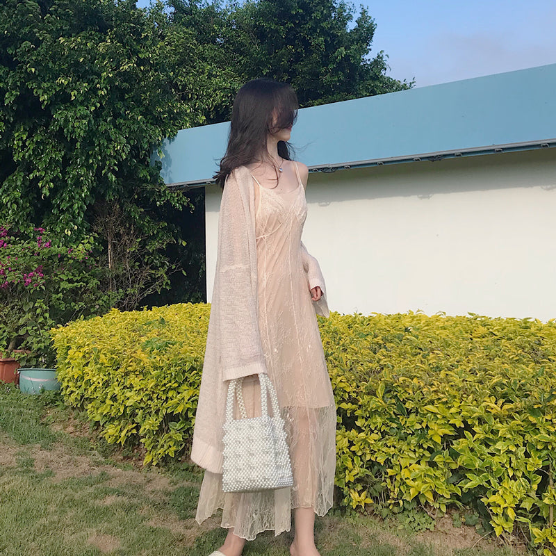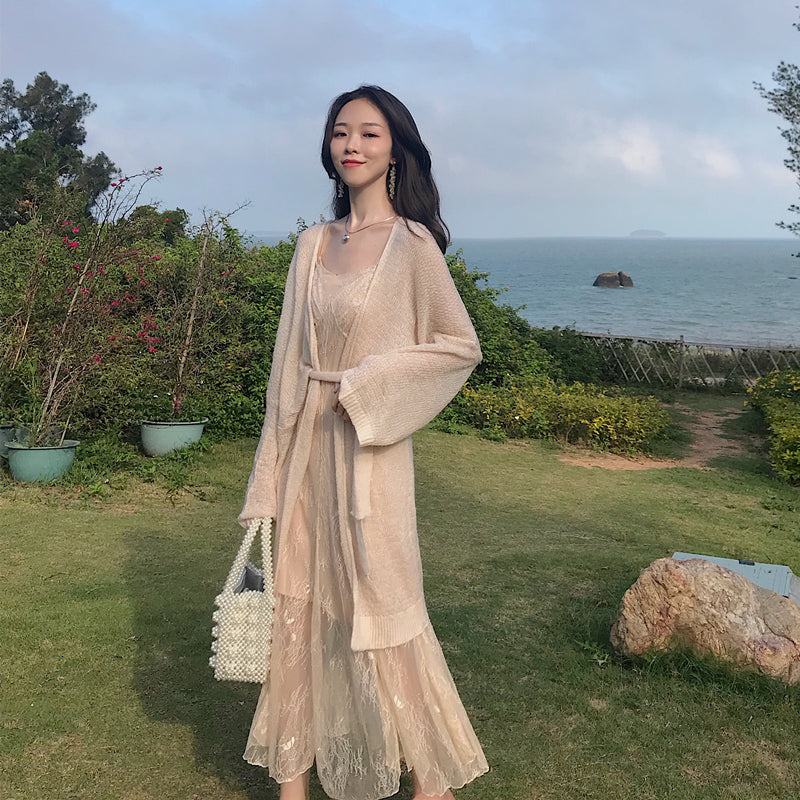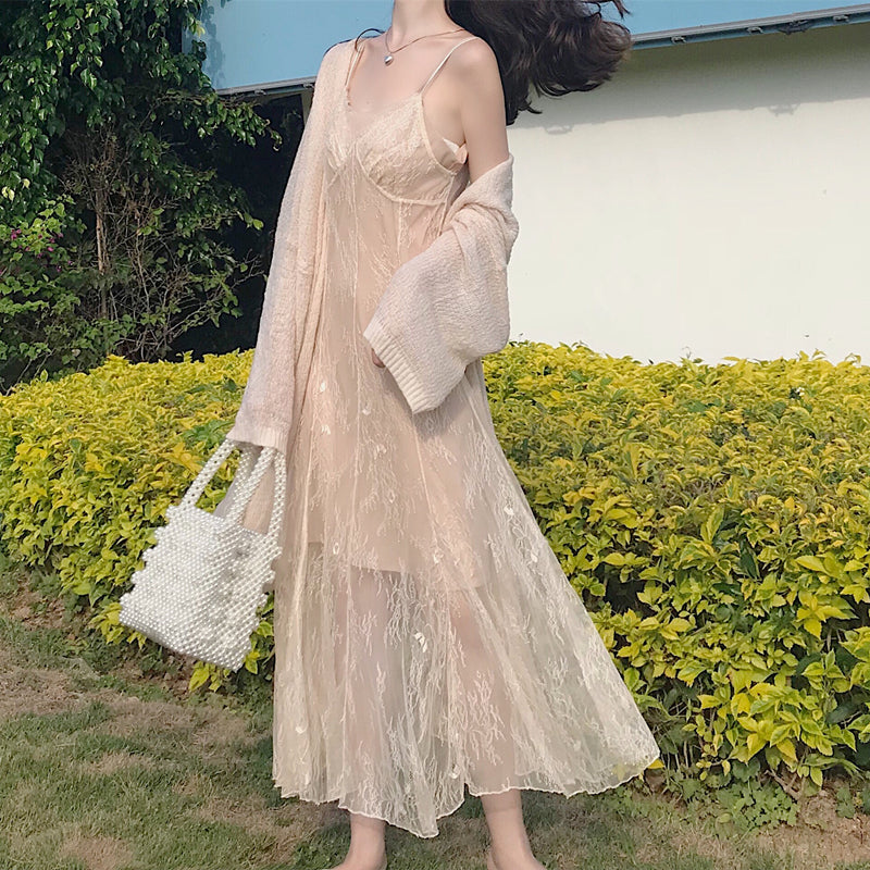 Lace Fishtail Sling Strap Temperament Fairy Dress Knitted cardigan Two Pieces set