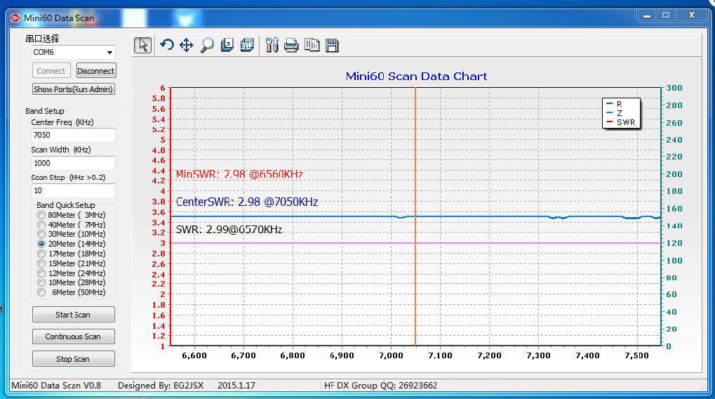 Automatic scanning results displayed as frequencies of lowest SWR and complex impedance