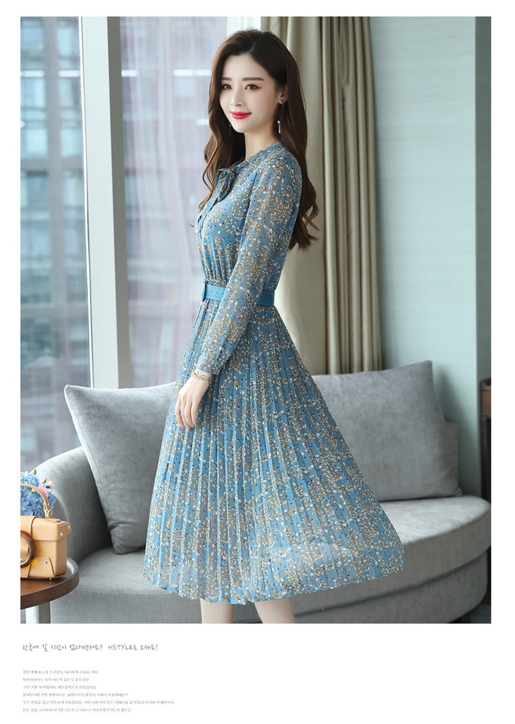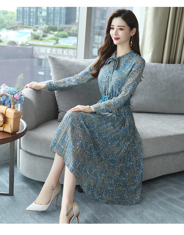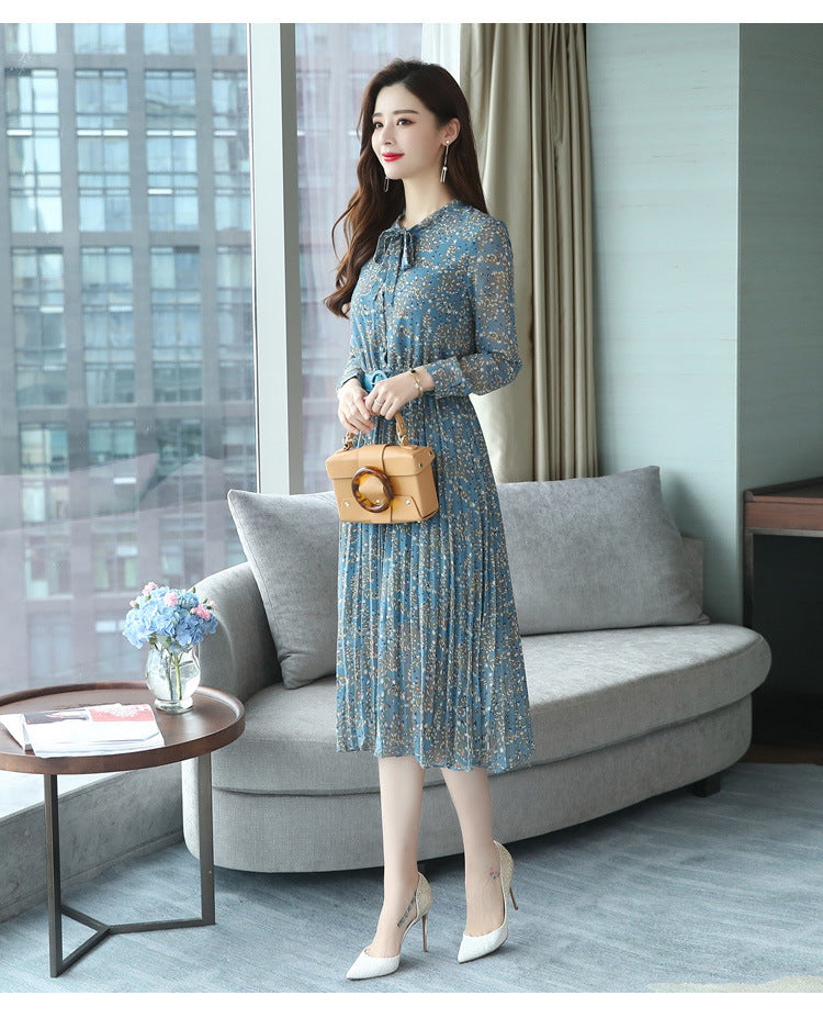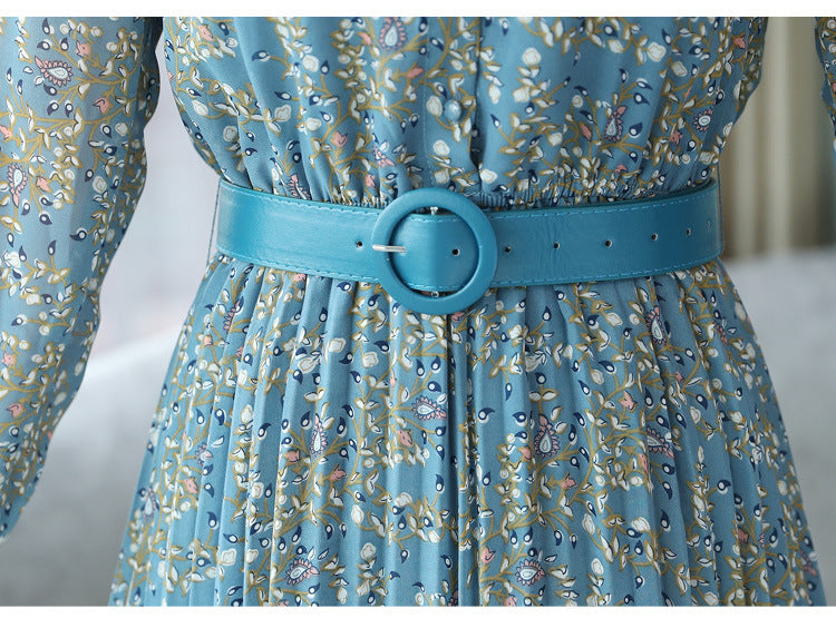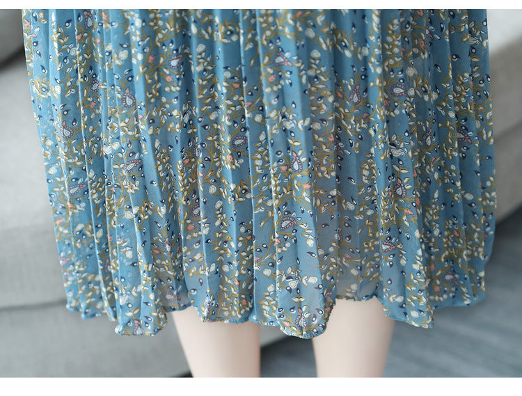 Vintage Retro Temperament Elegant Chiffon Big Swing Floral Long Midi Pleated Party Dress