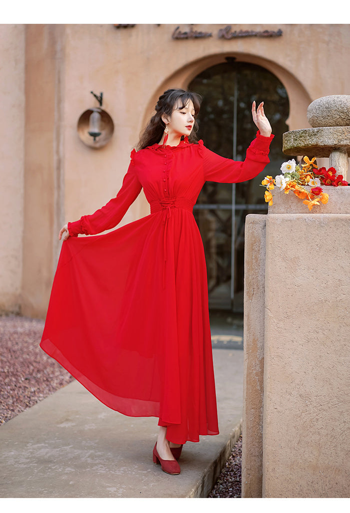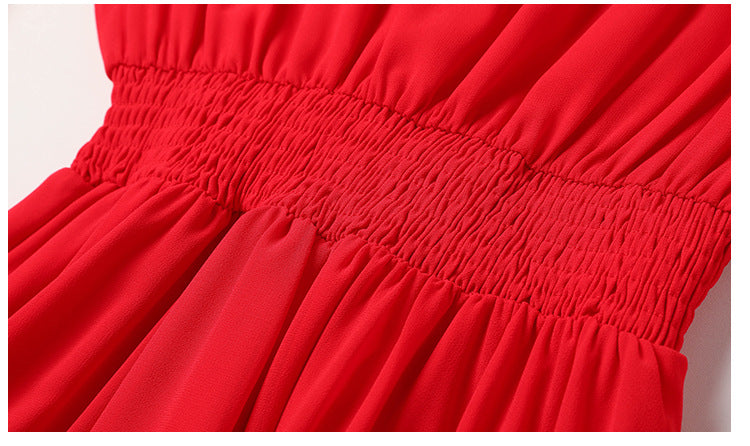 Women Red Seaside Holiday Ethnic Style Beach Skirt Elastic Waist Big Swing Long Dress