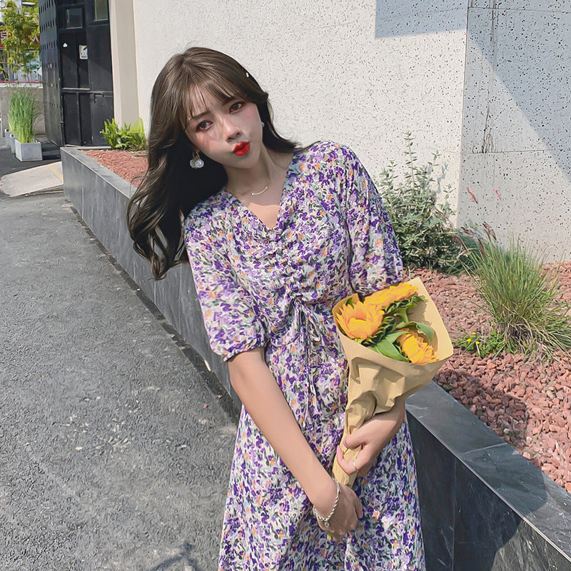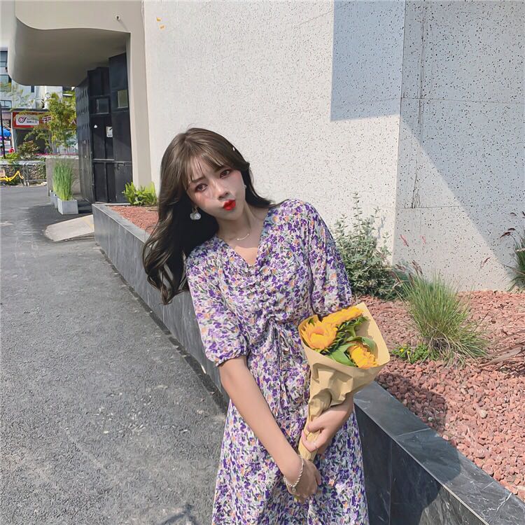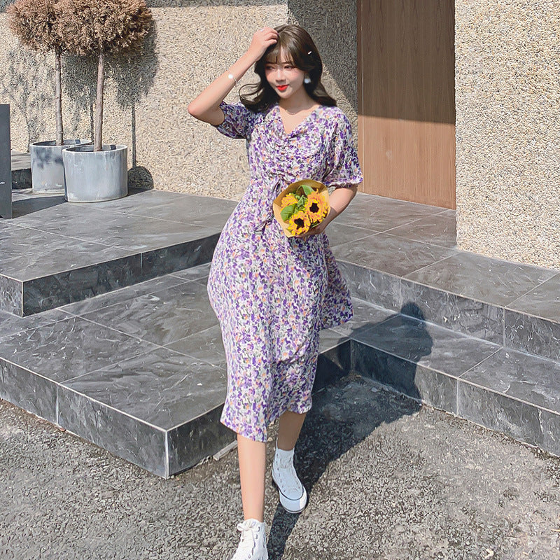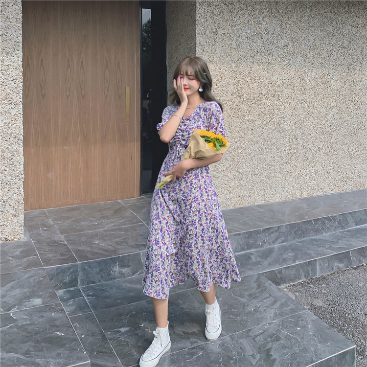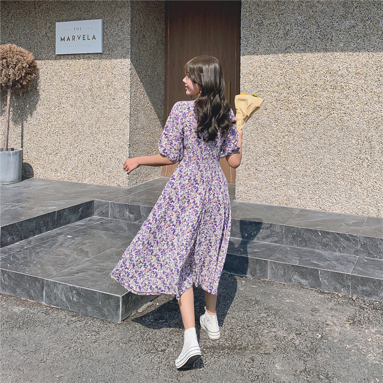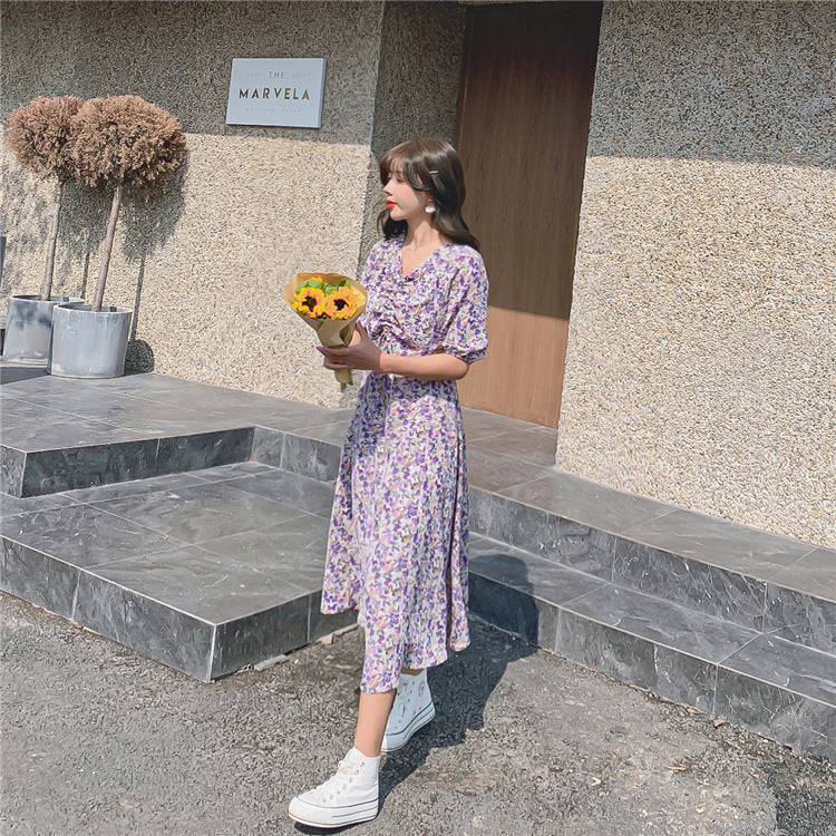 Women Retro Purple Chiffon Floral V Neck Short Sleeved Long Flare Dress