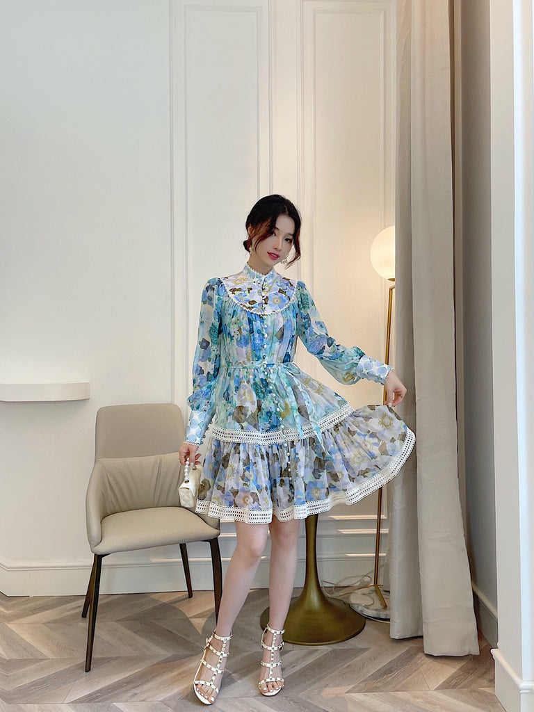 Amazing Summer Elegant Temperament Ladies Round Stand Collar Long Sleeves Paint Dye Printed High Waist Princess Dress