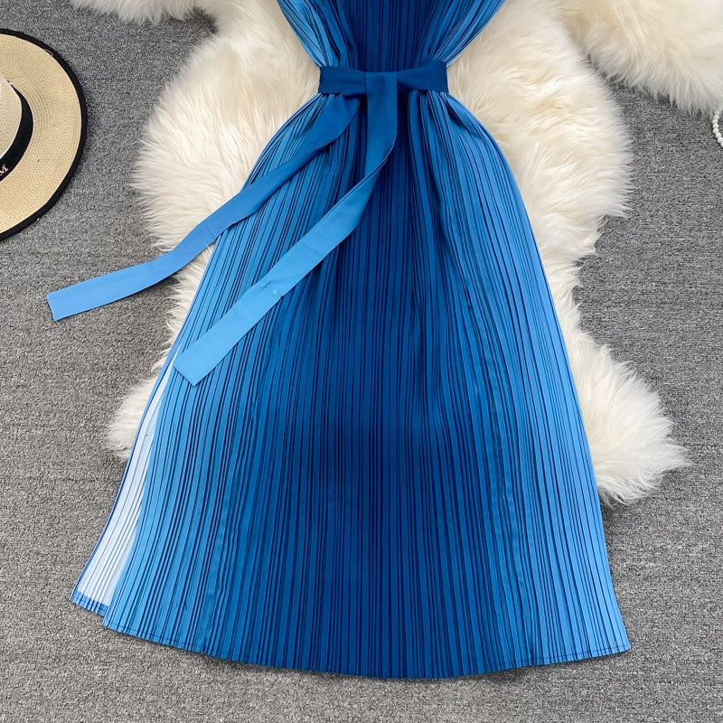 Amazing Summer Women Pleated Blue Gradient Color Change Sleeveless Round Neck Waist Belt Band Size Loose Dress