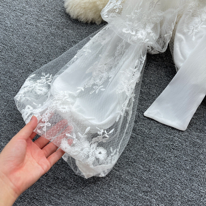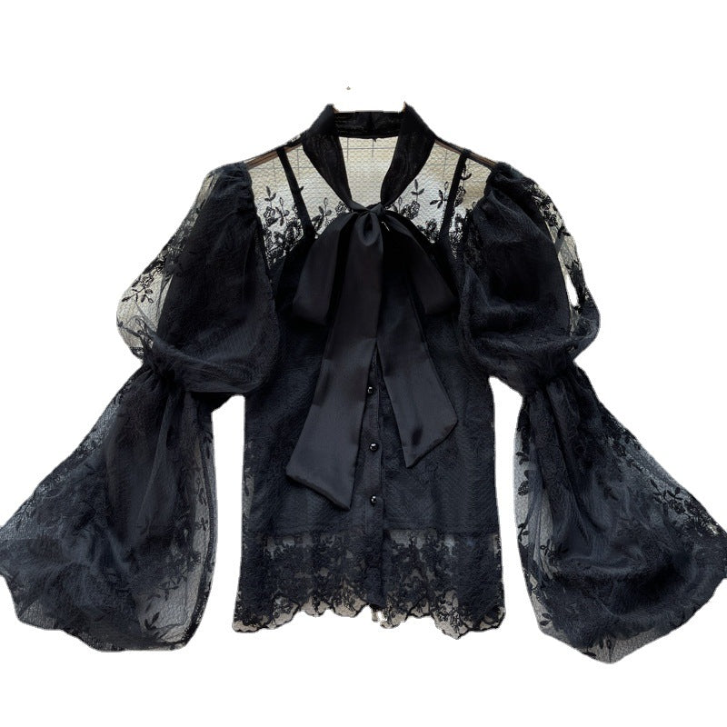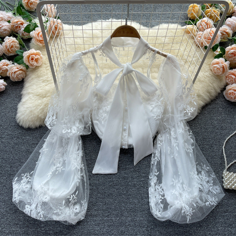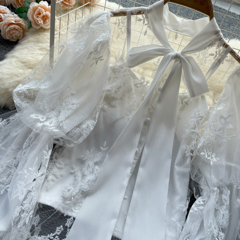 Autumn Fairy Women Bow Tie Puff Sleeve Lace Mesh Bow Camisole Embroidery Hollow Two Pieces Set Top