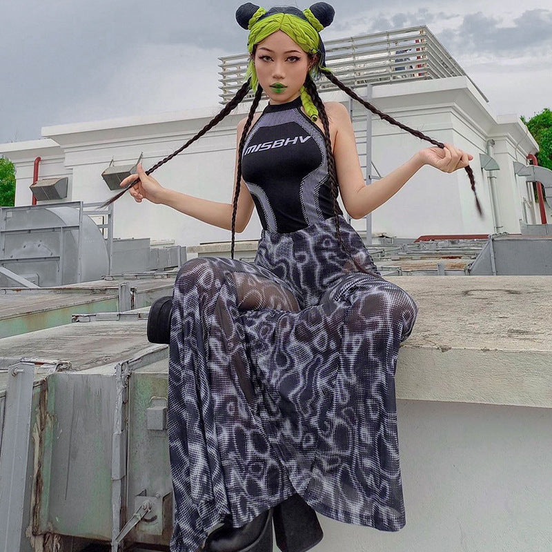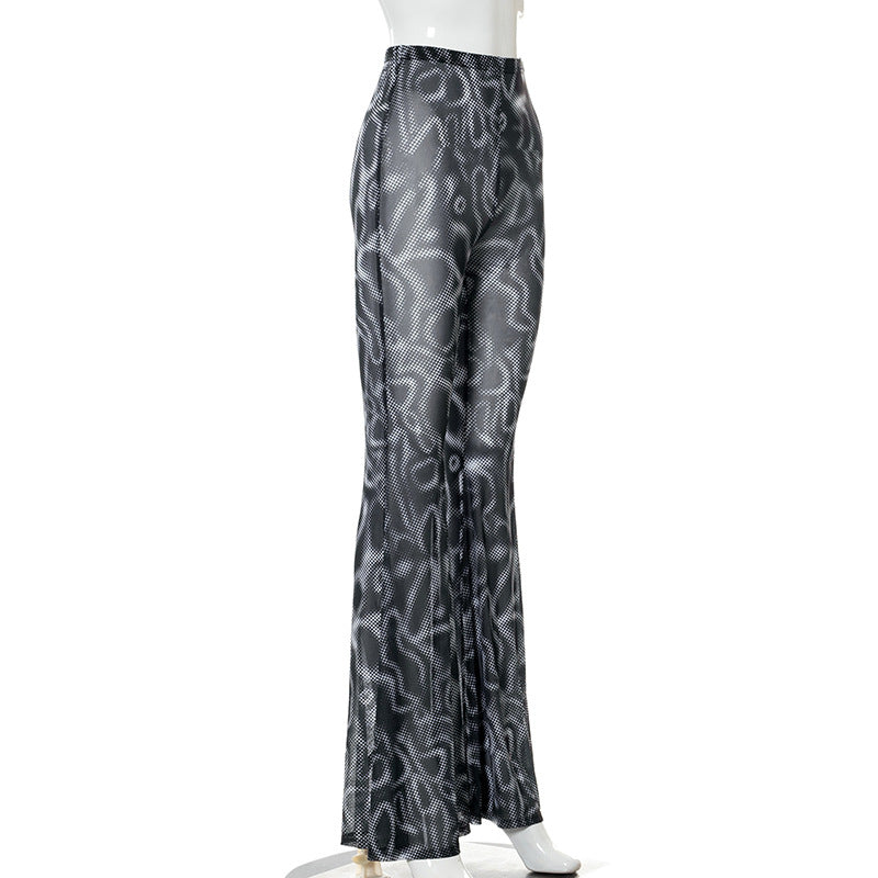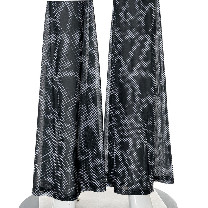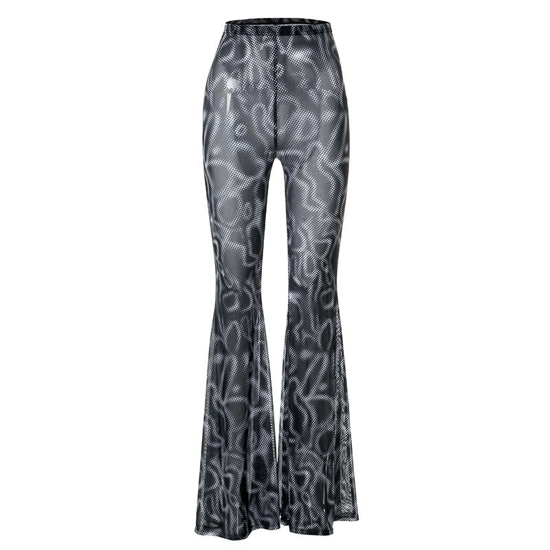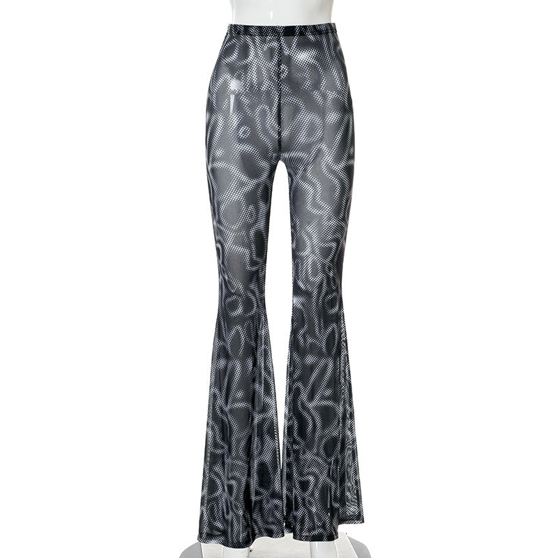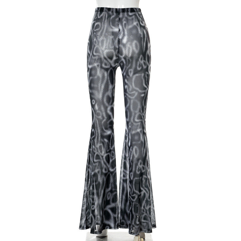 Casual Trendy Women Gothic Black Printing High Waist Gauze See Through Flared Trousers Wide Leg Pants