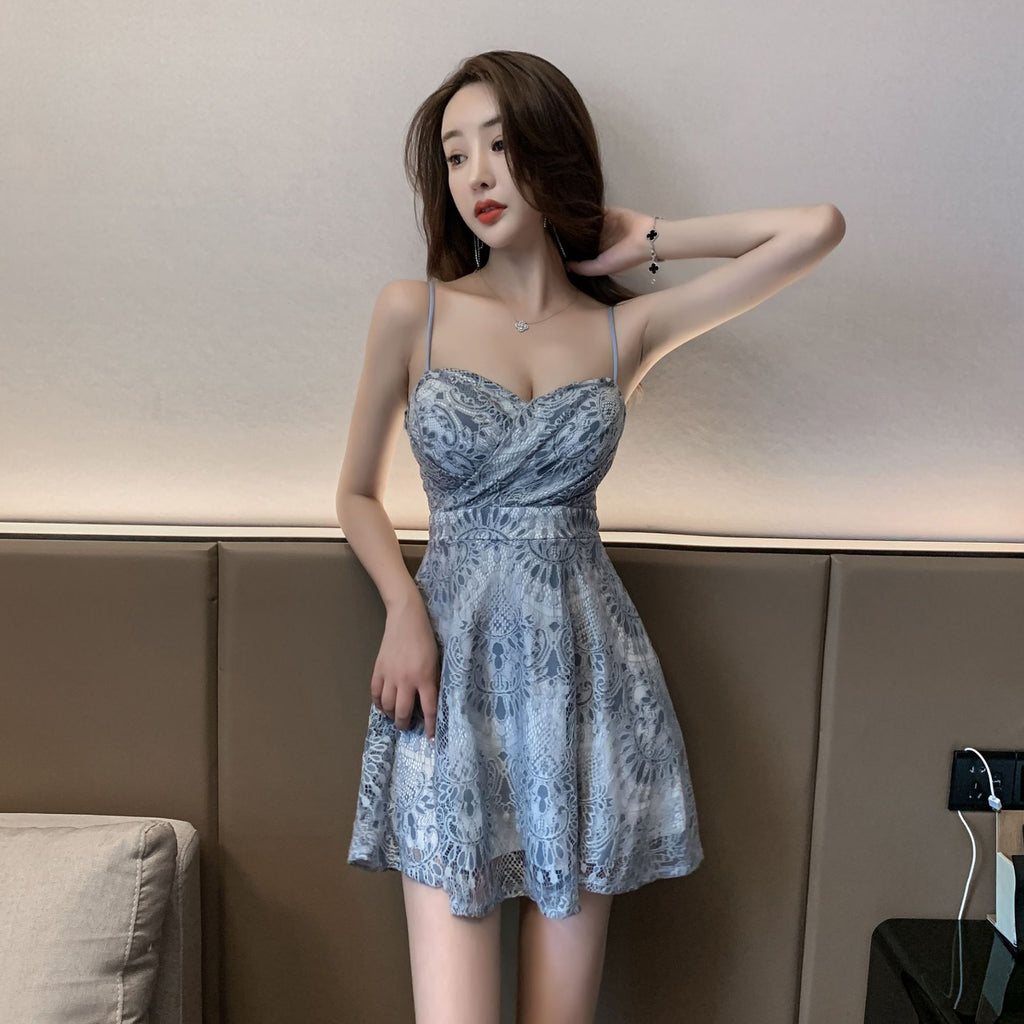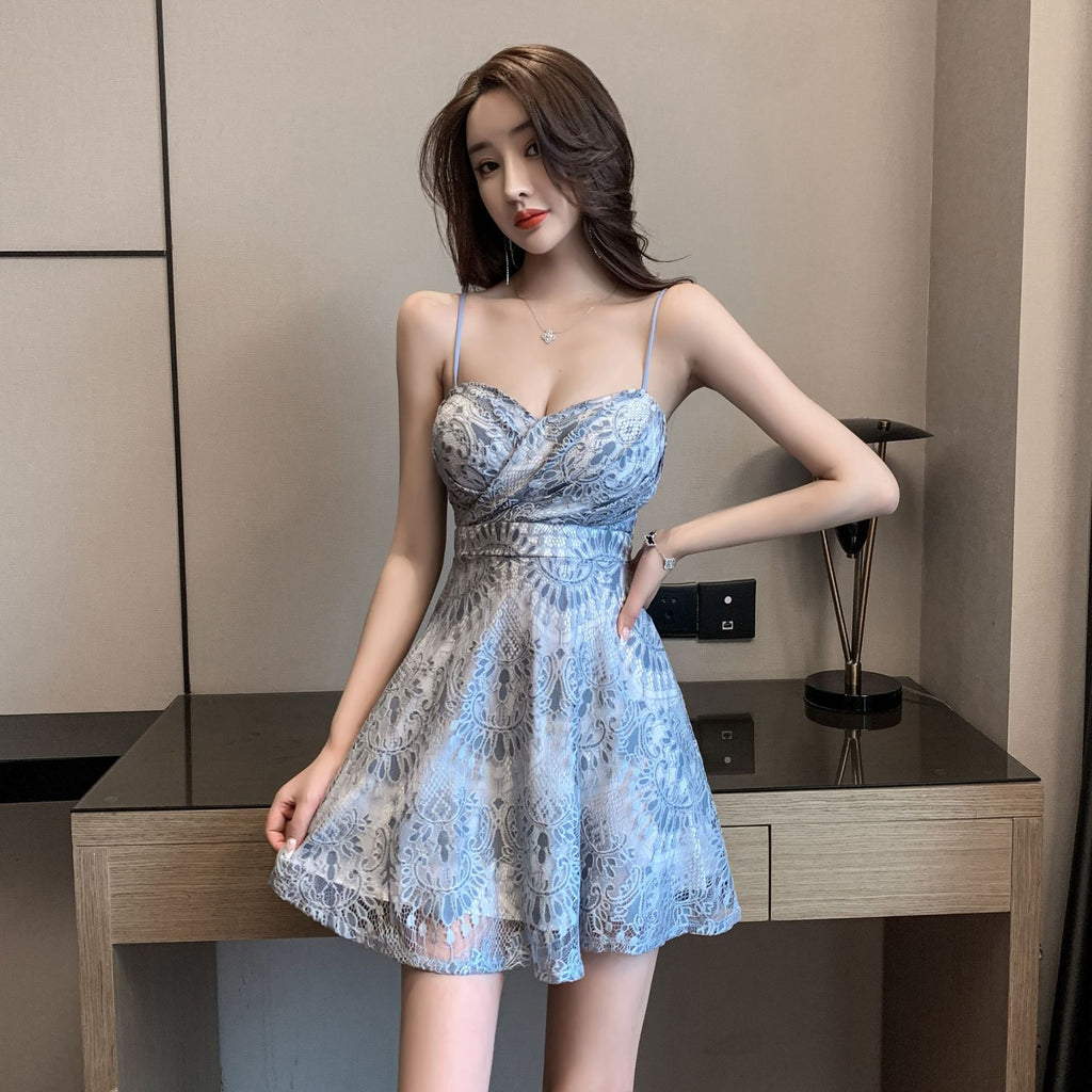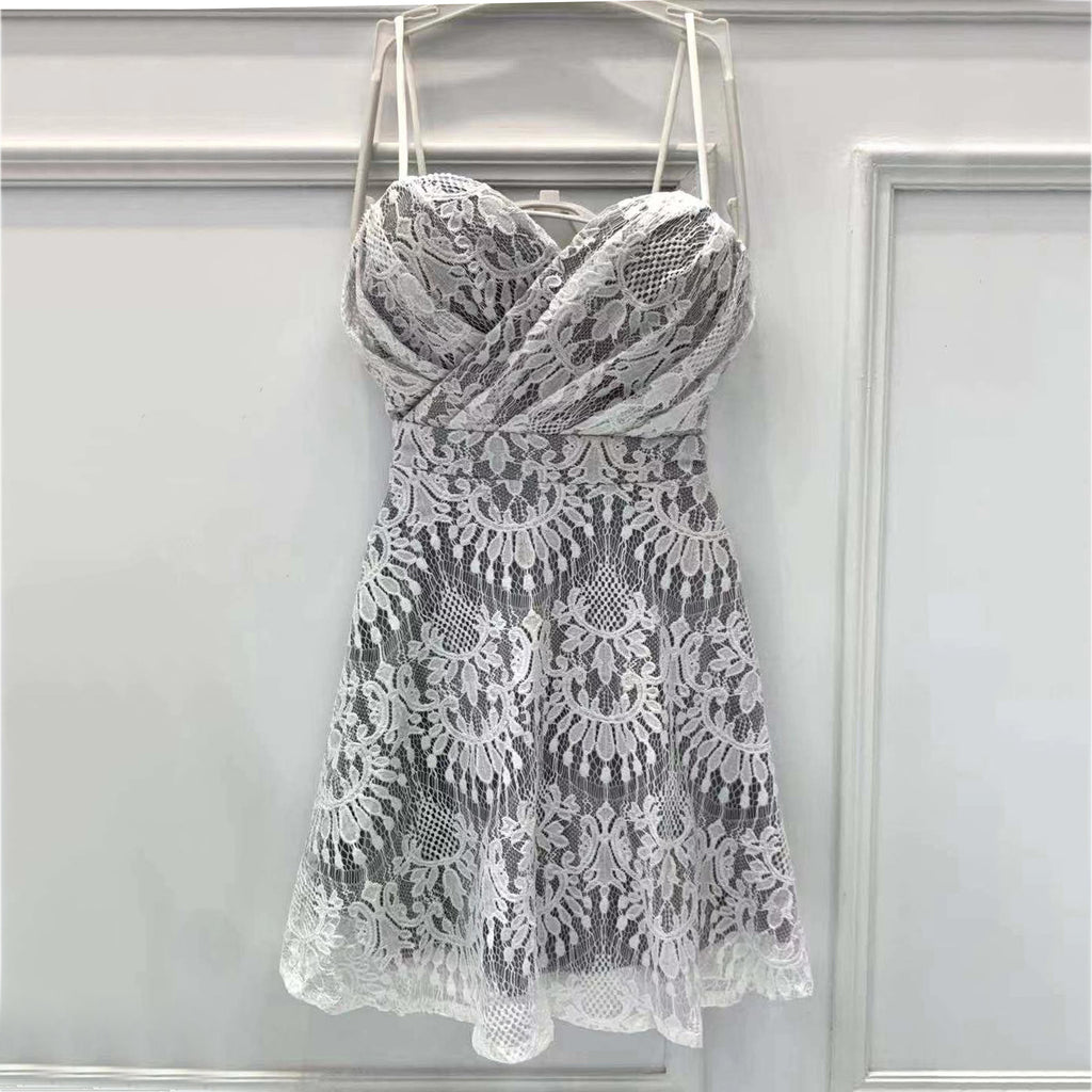 Clubbing Elegant Sexy V-neck Floral Lace Low Cut High Waist Spaghetti Strap Pleated Dress