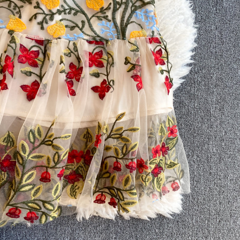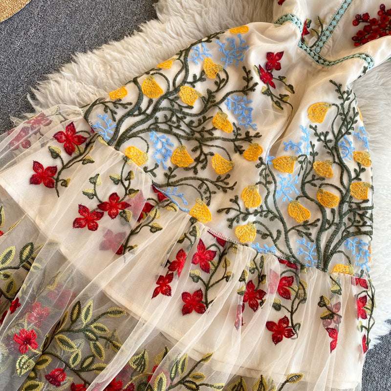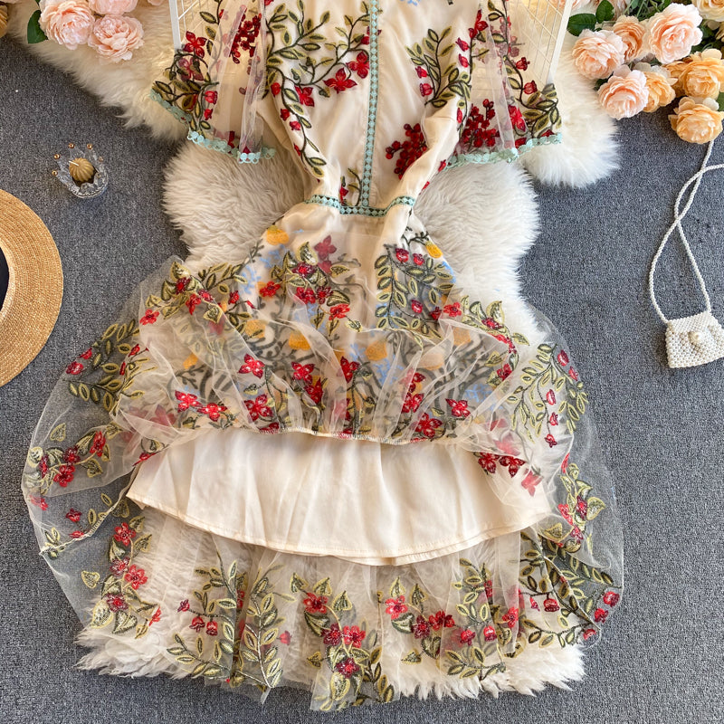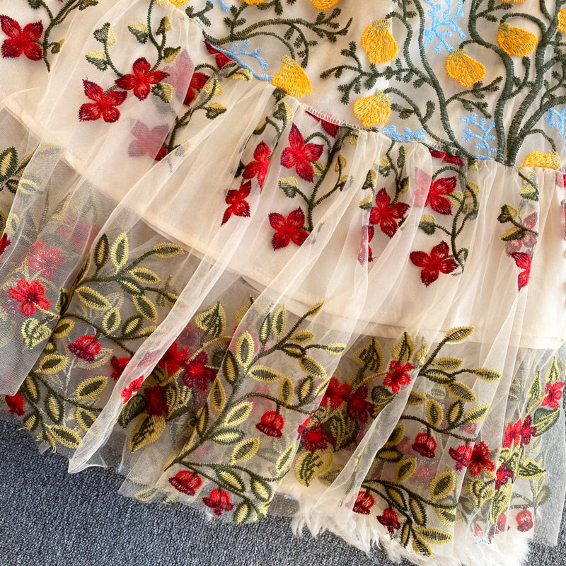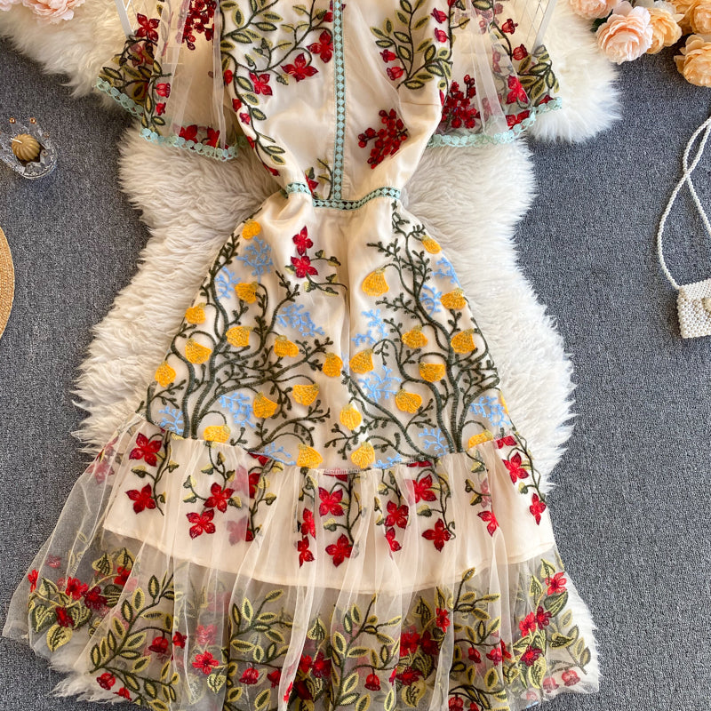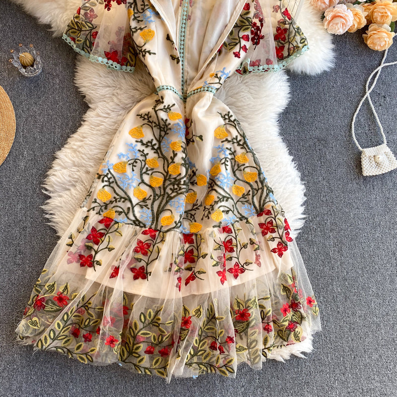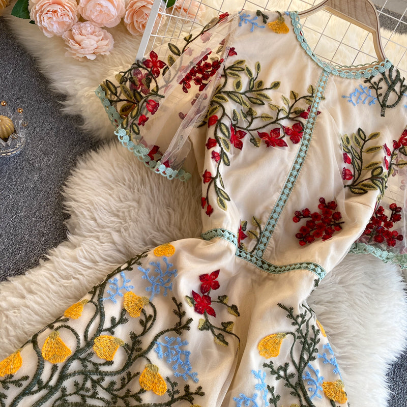 Cozy Retro Style Chic Women Beautiful Round Neck Short Sleeves Mesh Floral Embroidered A Line Dress