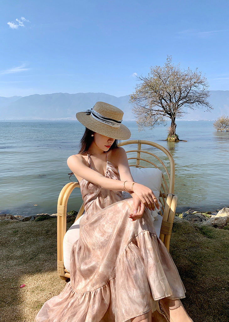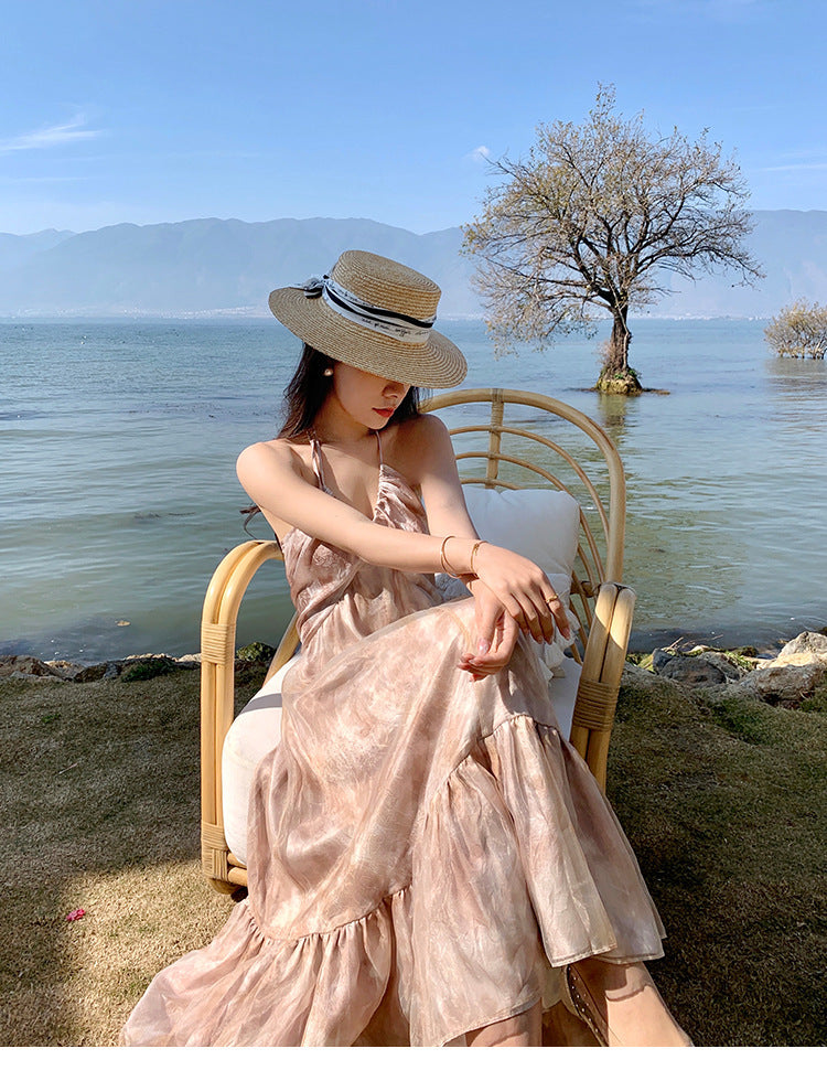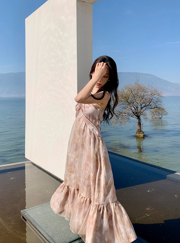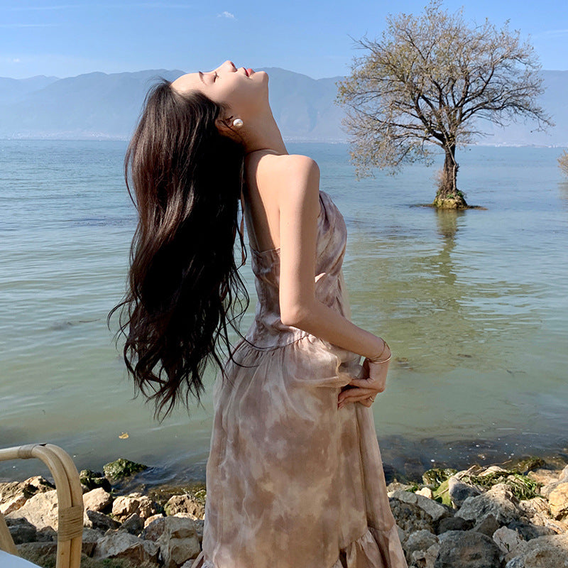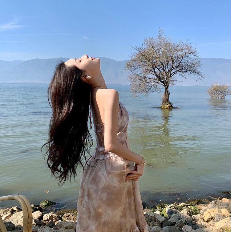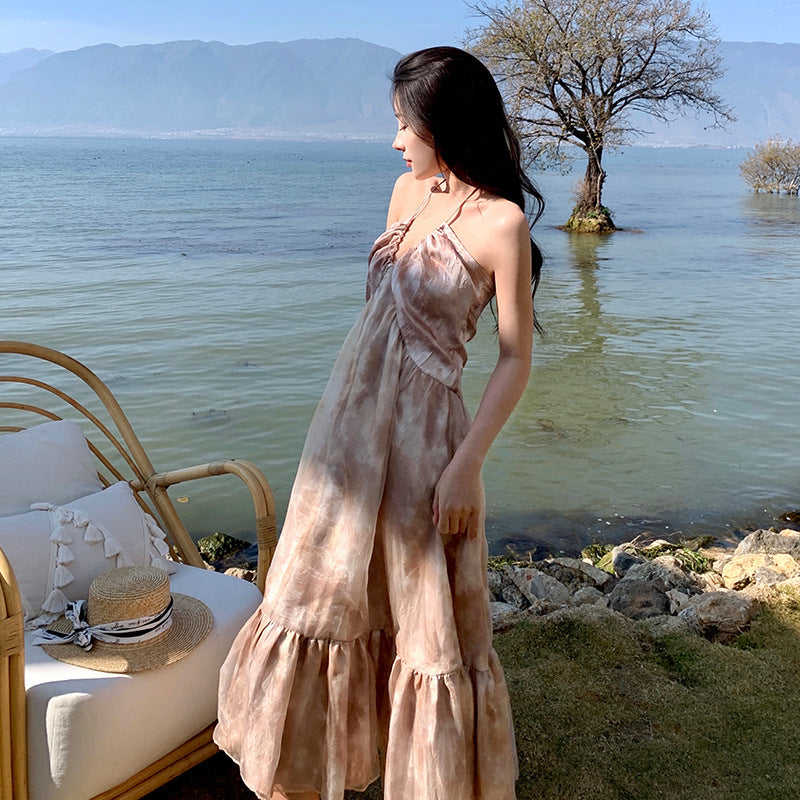 Cozy Seaside Summer Holiday Organza Halter Tie Dye Strap Wrap Bust Pleated Hem Long A-Line Women Dress