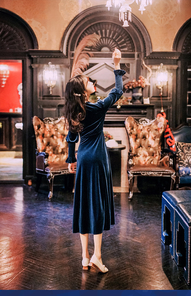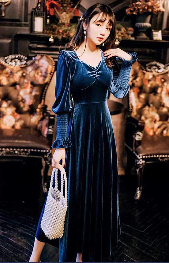 Elegant Women Retro Traditional Shiny Blue Velvet Ruffled Bust Long Sleeved Long Dress