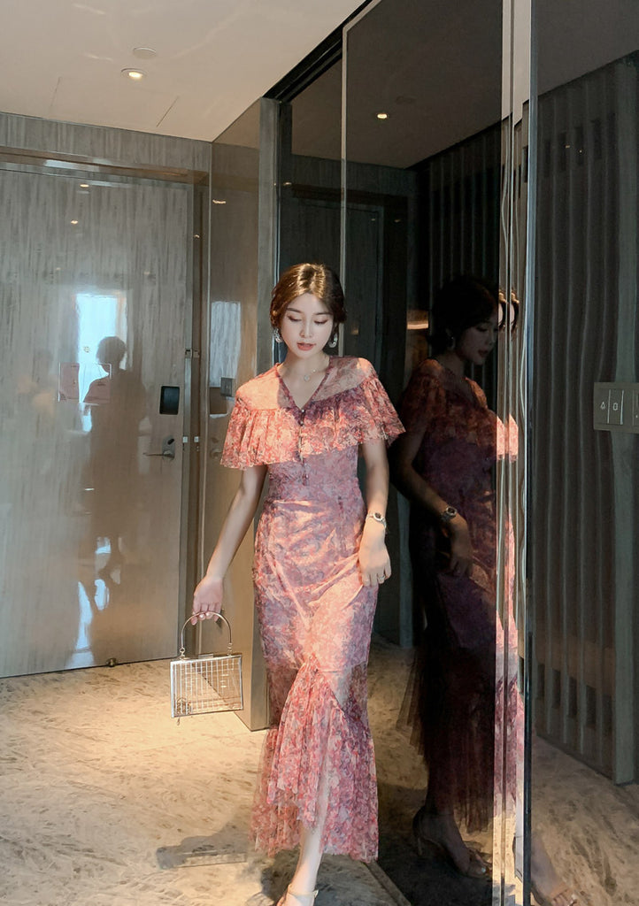 Fairy Summer Sweet Elegant Women Romantic Ruffle Floral Lace Fishtail Pleated Long Dress