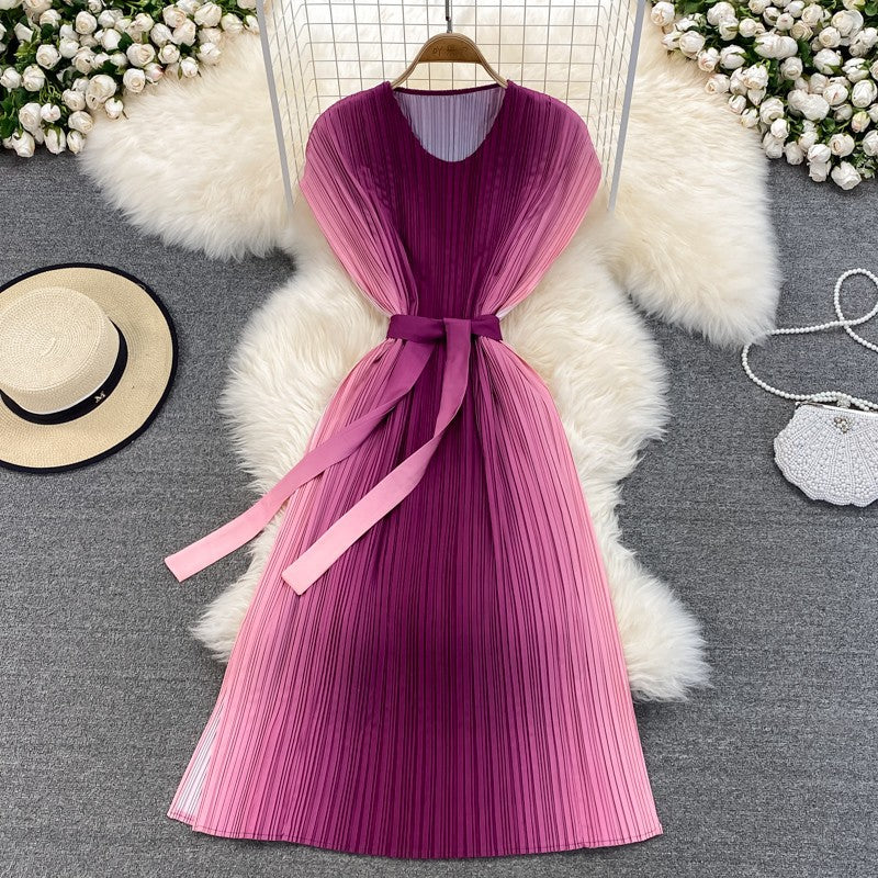 Great Look Summer Women Pleated Pink Gradient Color Change Sleeveless Round Neck Waist Belt Band Size Loose Dress