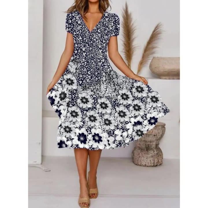 Holiday Flower Floral Tunic Printed V Neck Short Sleeves Big Swing Dress