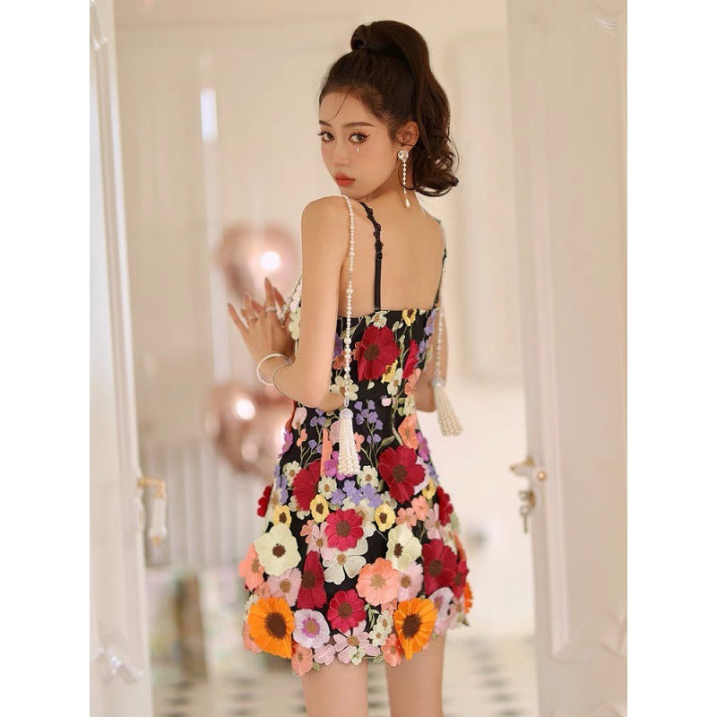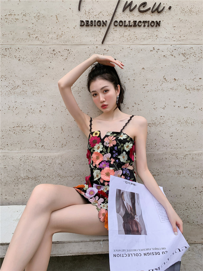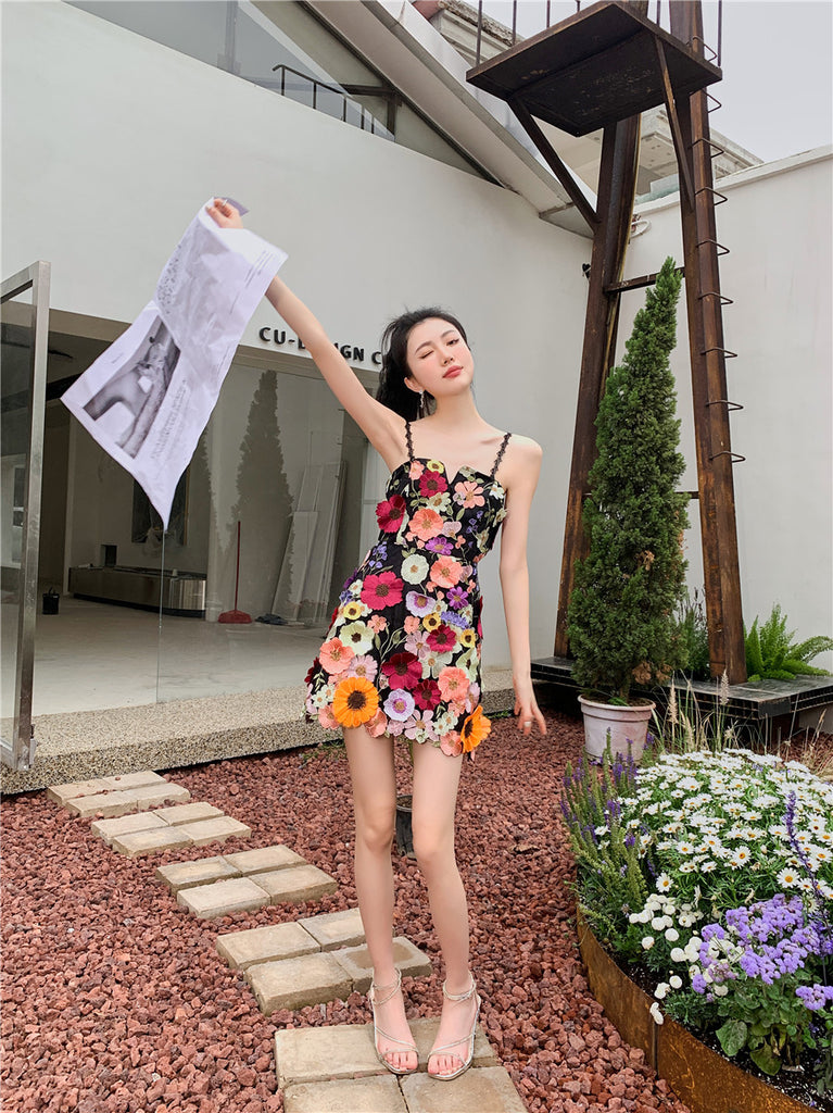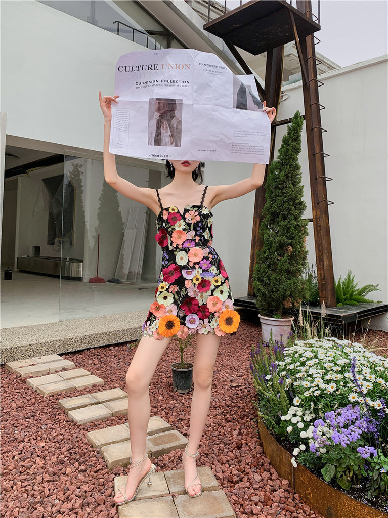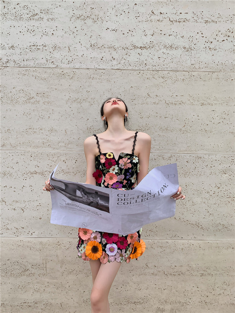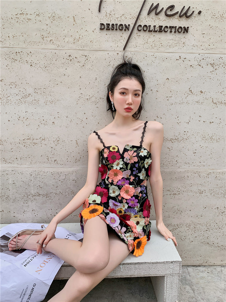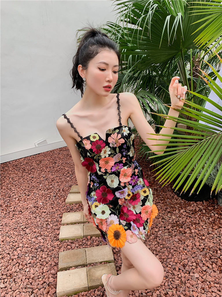 Lovely Women Three Dimensional 3D Embroidery Floral Flowers Pattern Hollow Out Spaghetti Strap Mini Party Dress