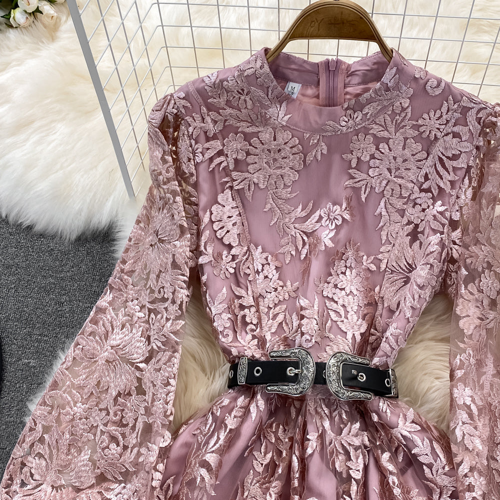 Luxury Temperament Women Stand Up Collar Lantern Long Sleeved Lace Waist A Line Mesh Floral Embroidery Pleated Hem Dress